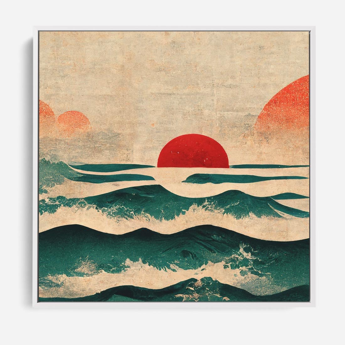 Obraz w ramie 50x50 - Czerwone Melodie - japońska sztuka, zachód słońca nad oceanem - rama biała