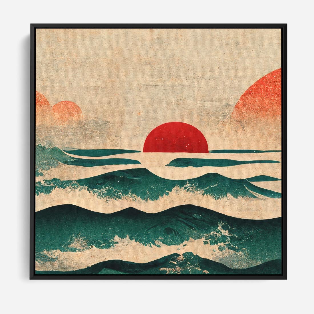 Japońska sztuka na płótnie, która przenosi nas w świat spokoju i harmonii. Widok zachodu słońca nad oceanem malowany na starym papirusie emanuje mistycznym urokiem. Styl japandi, charakteryzujący się minimalistycznym pięknem, doskonale współgra z dynamiką fal. Czerwone słońce nadaje obrazowi wyjątkowego nastroju, przenosząc nas w pejzaż dalekiej Japonii. To dzieło sztuki, które oczarowuje i zachwyca.