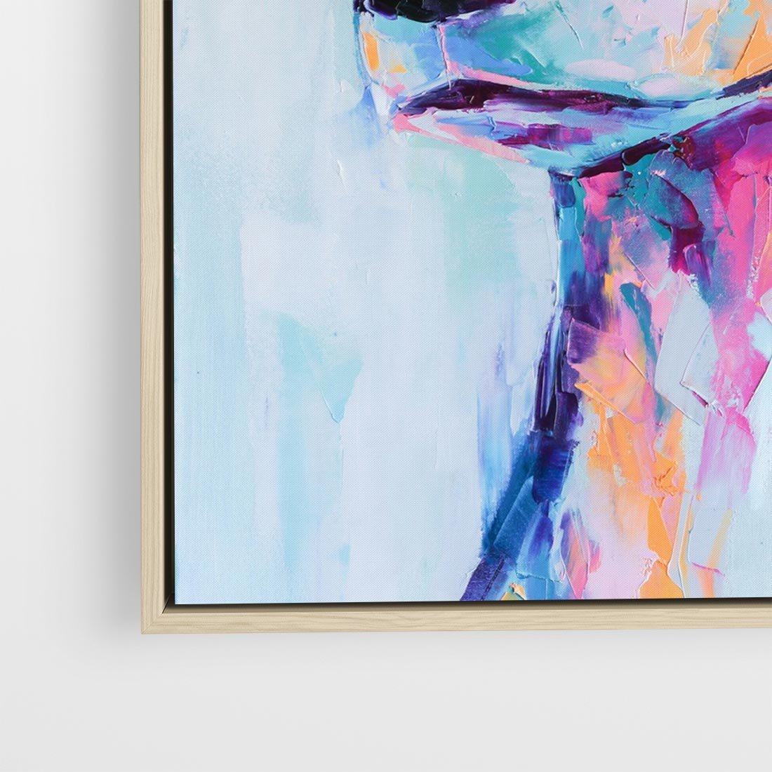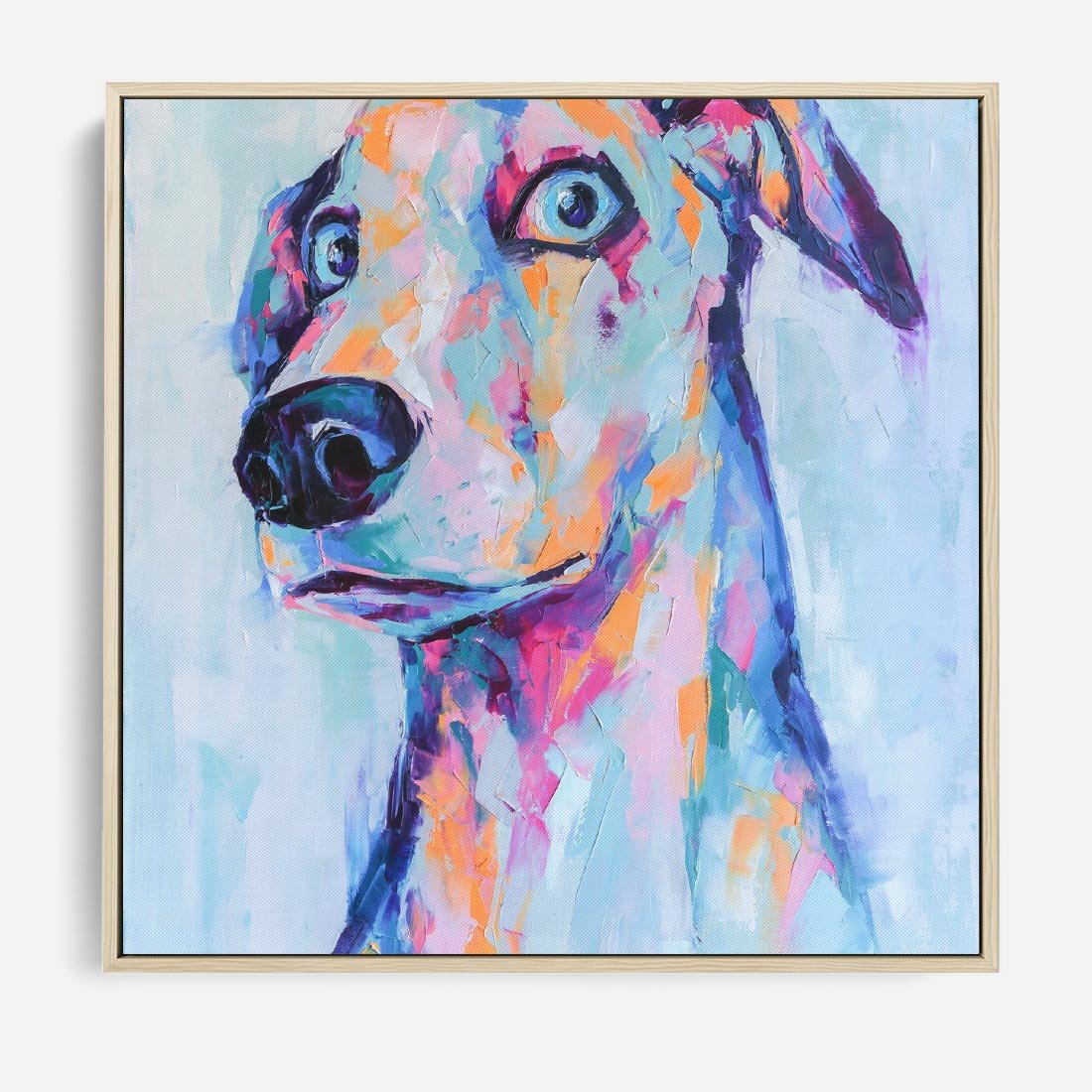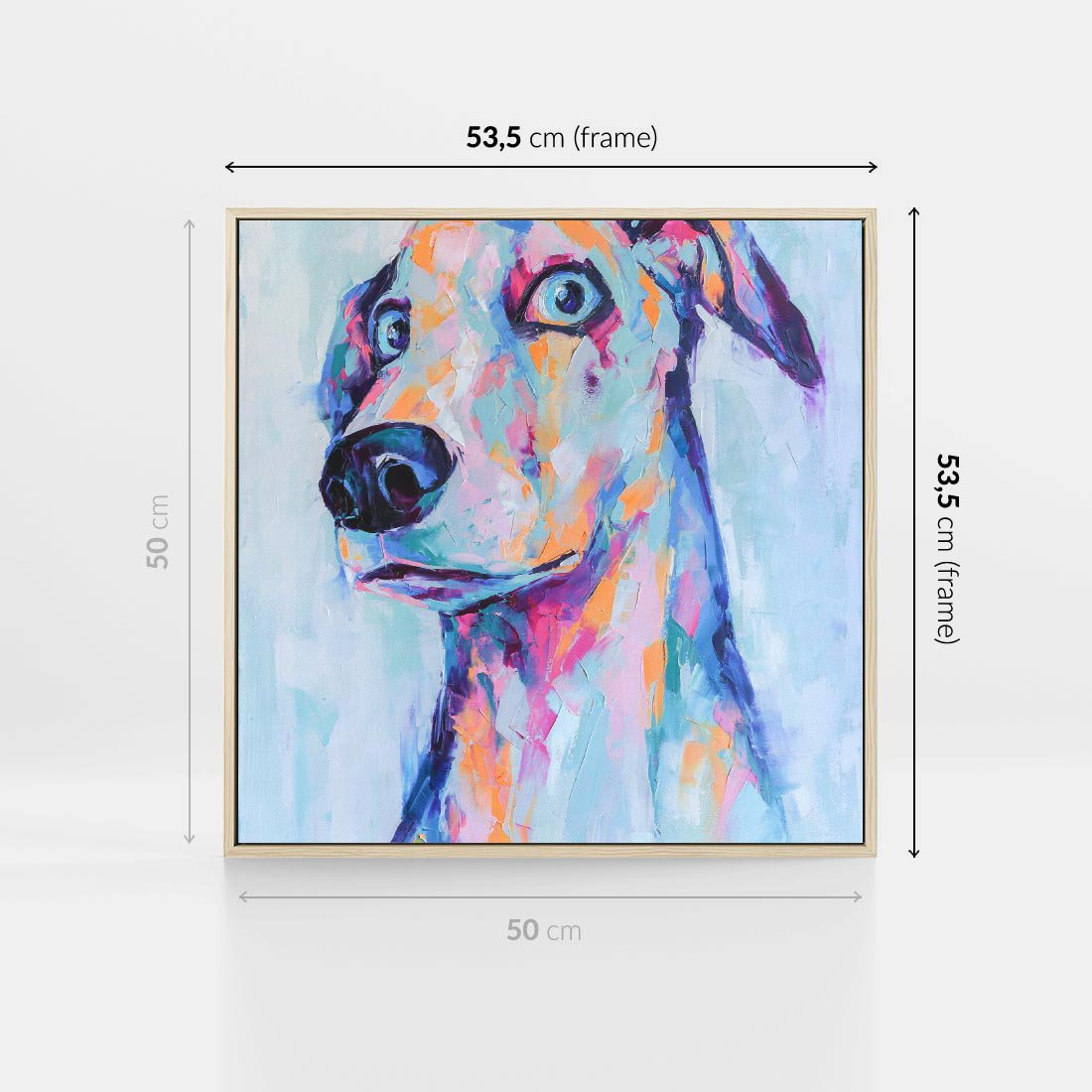 Ten olejny obraz to nie tylko portret psa, ale także zabawna i nowoczesna sztuka, która wykorzystuje pastelowe kolory, aby przekazać radość i humor. W centrum obrazu znajduje się portret uroczego psa. Pastelowe kolory nadają obrazowi lekkości i przyjemności. To dzieło sztuki doskonale pasuje do wnętrz, gdzie doceniane są zarówno nowoczesność, jak i poczucie humoru, a także jest znakomitą dekoracją dla miłośników psów.