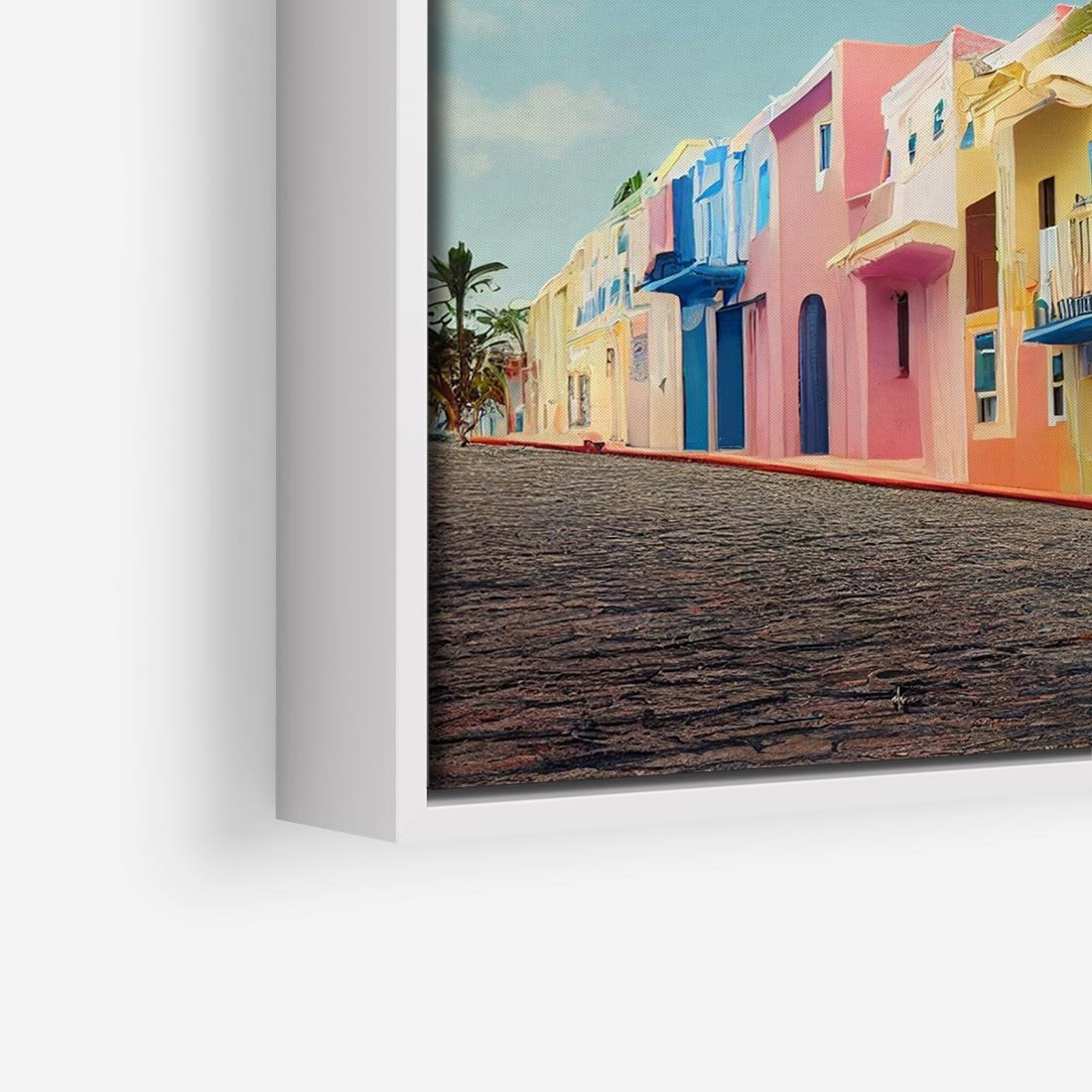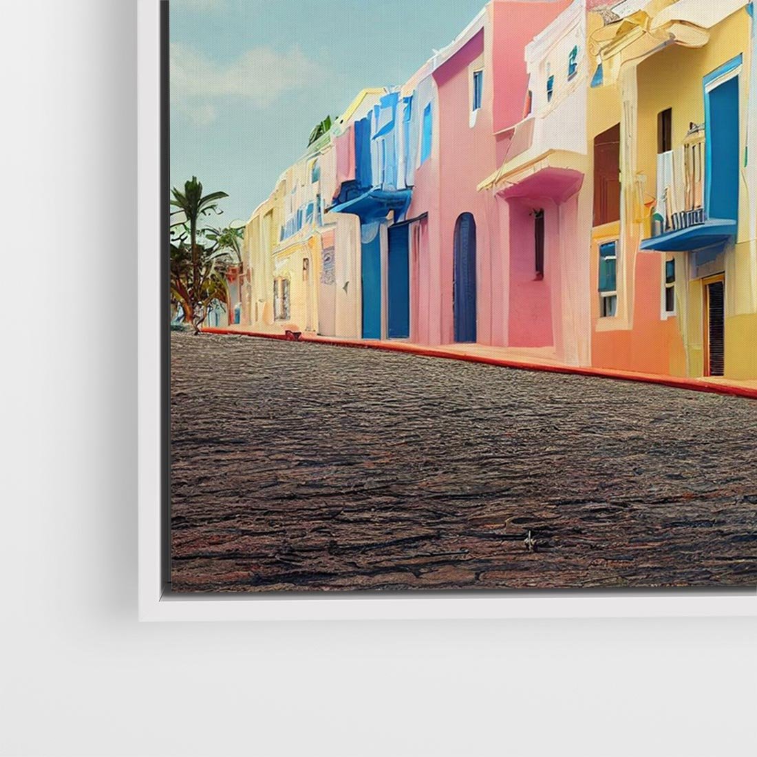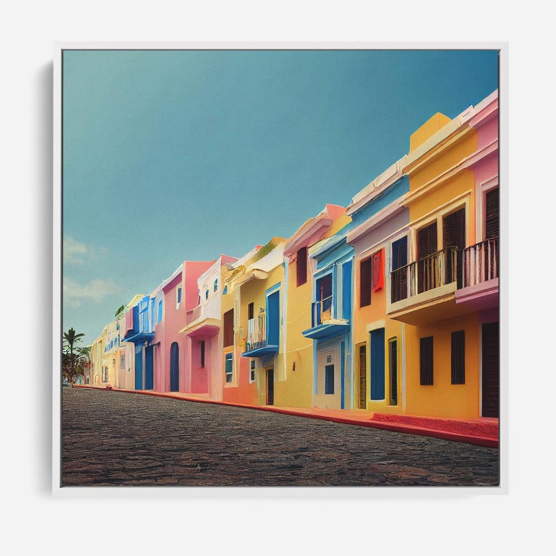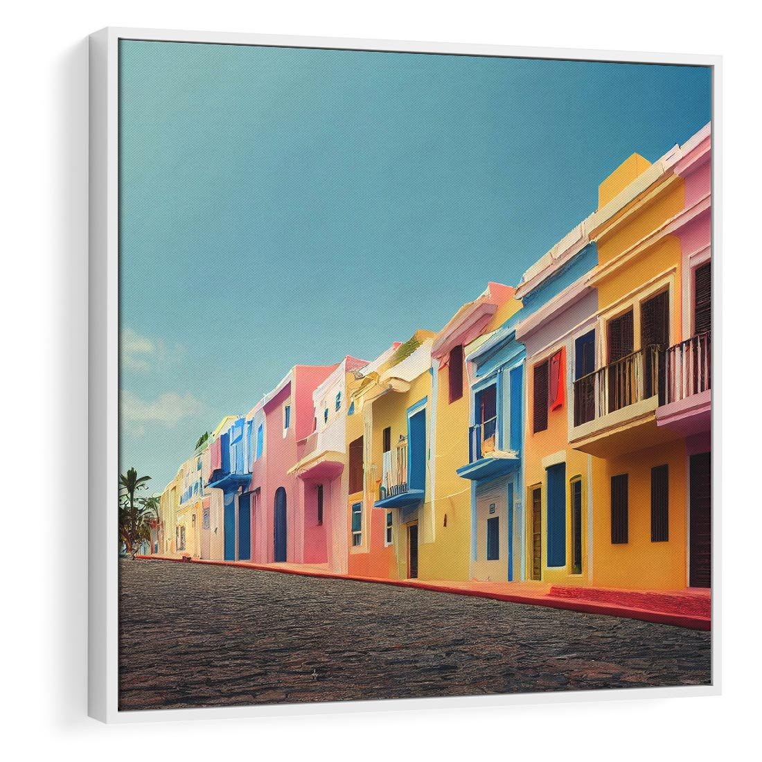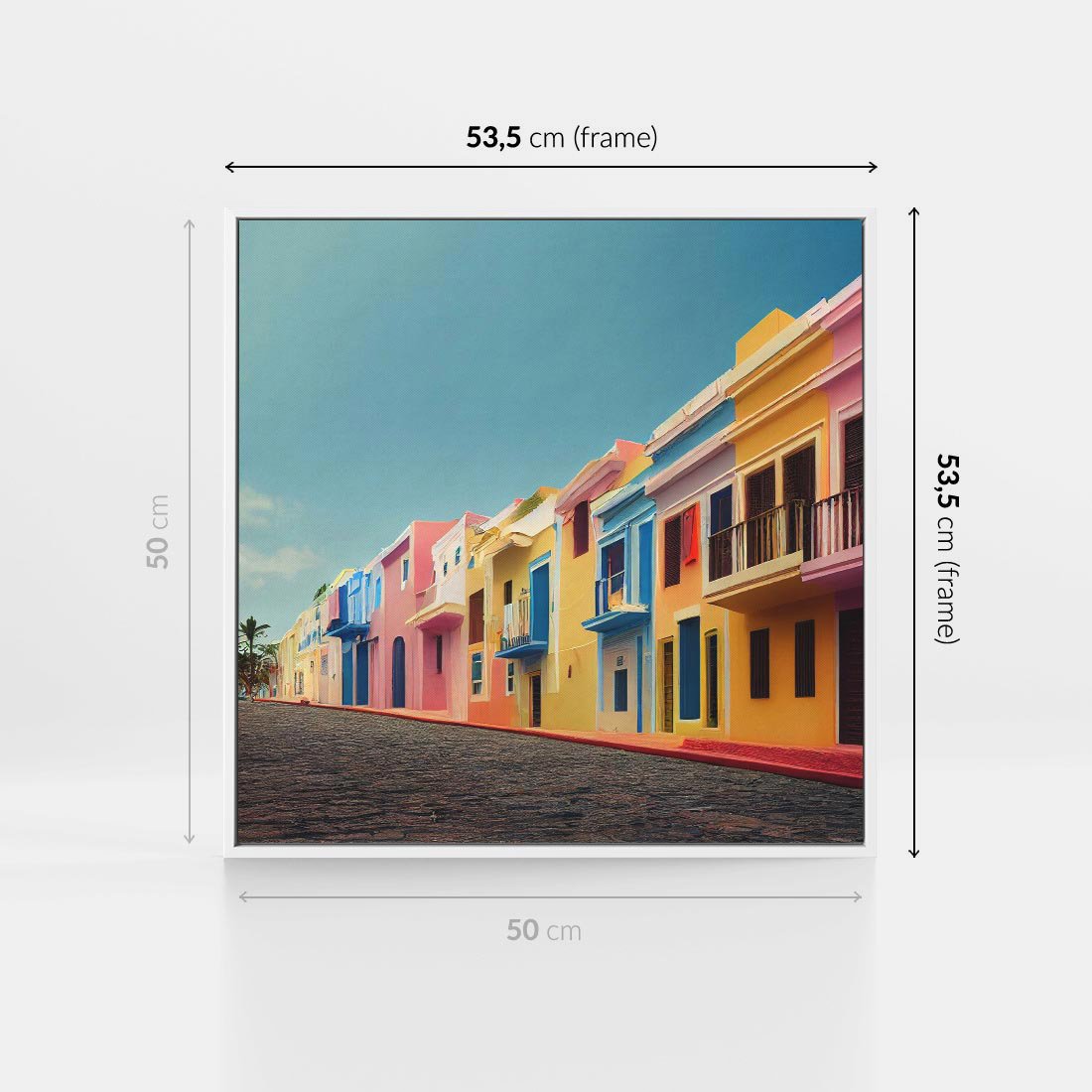 Obraz w ramie 50x50 - Ekspresja marzeń i tęsknot - pastelowe kolorowe budynki, wzdłuż ulicy - rama biała