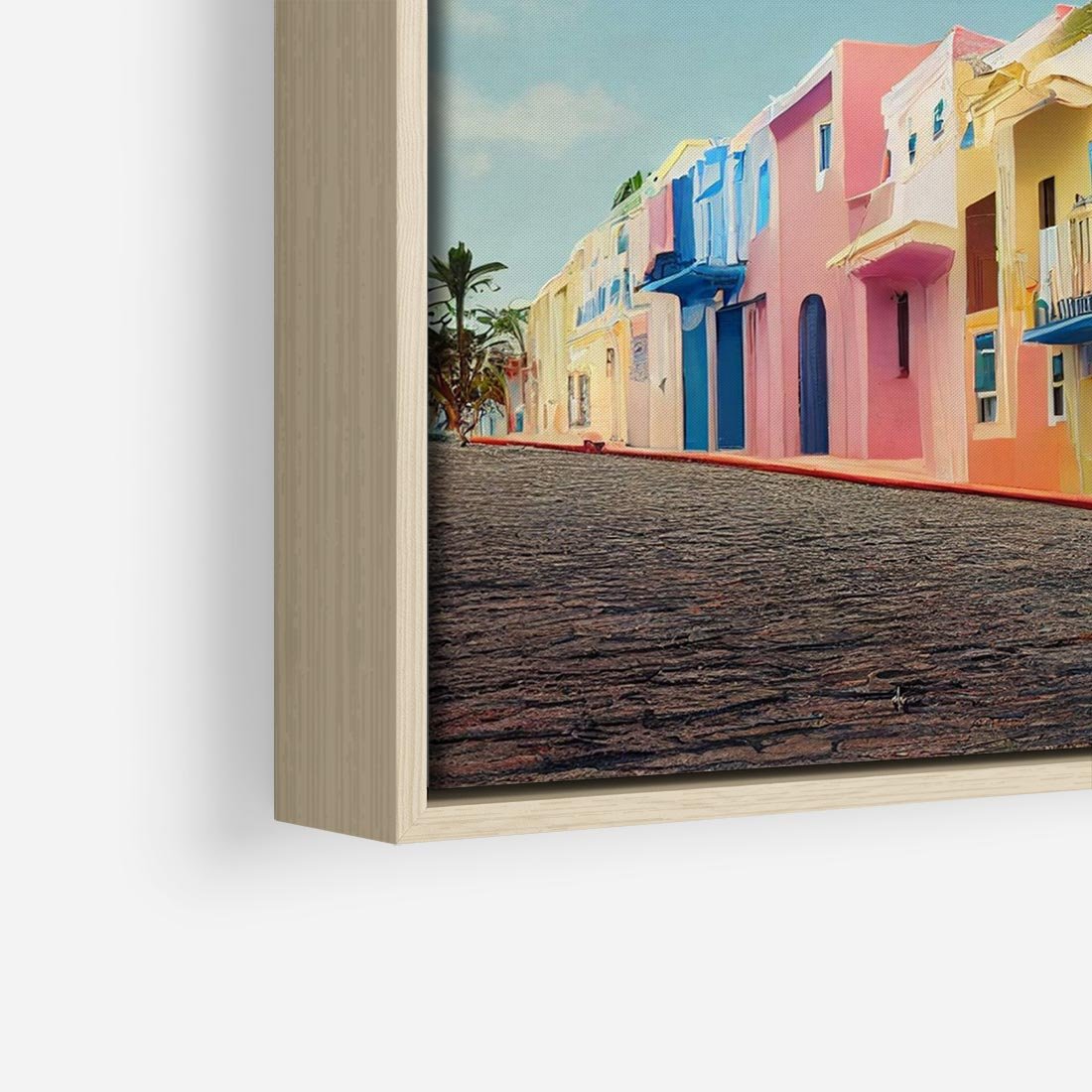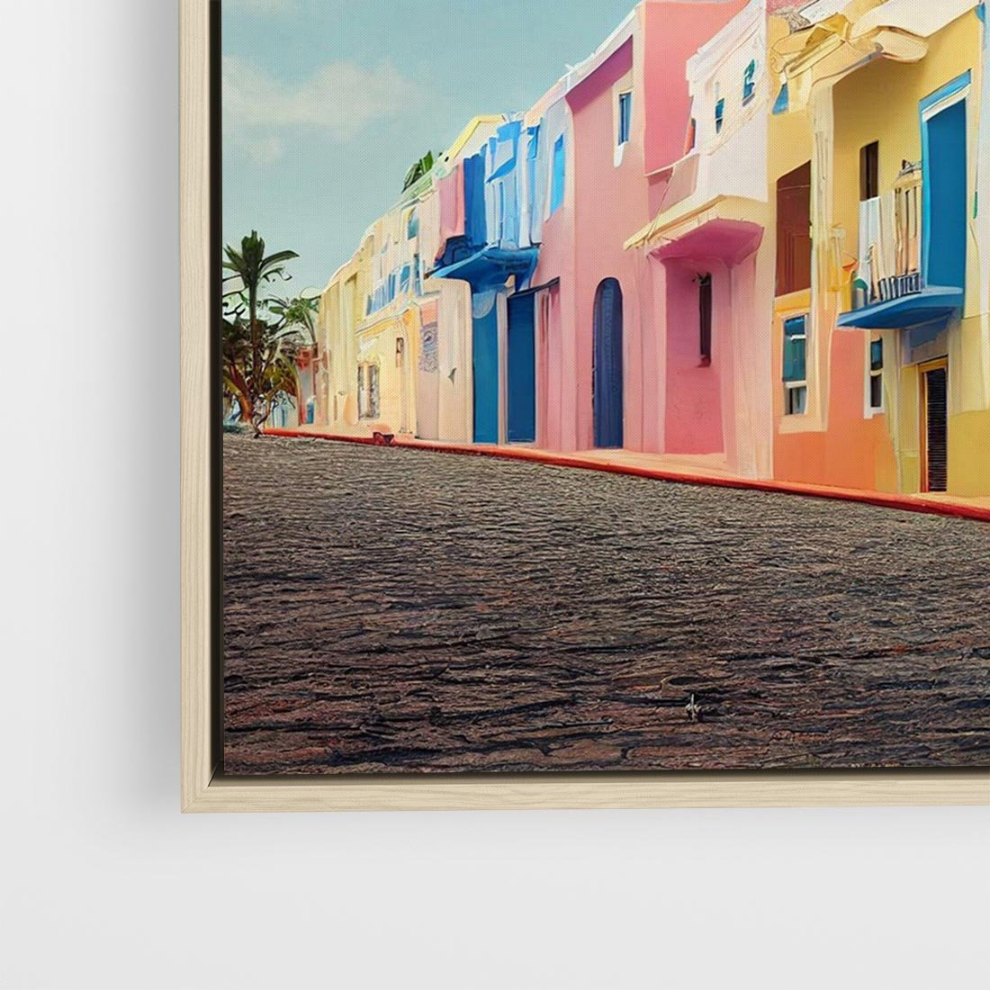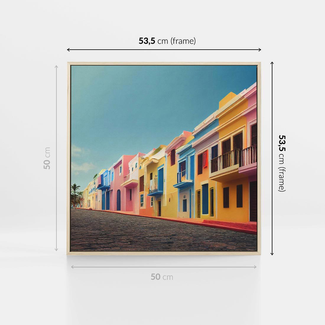 Obraz w ramie 50x50 - Ekspresja marzeń i tęsknot - pastelowe kolorowe budynki, wzdłuż ulicy - rama drewno