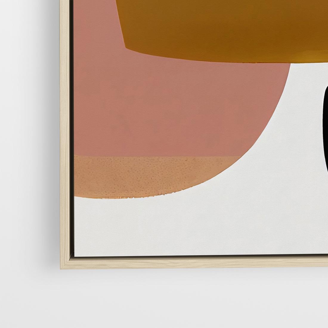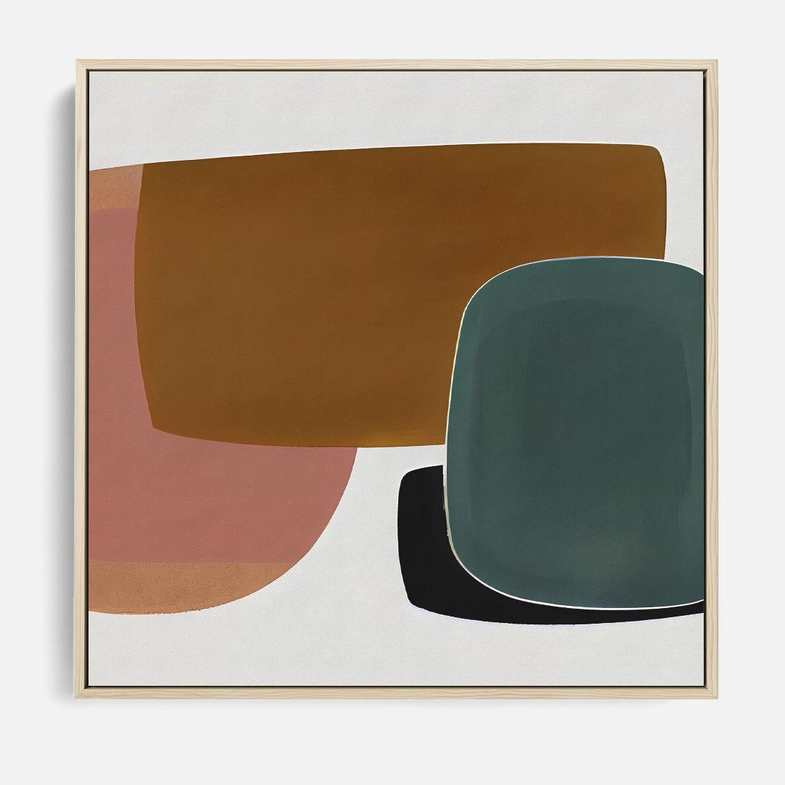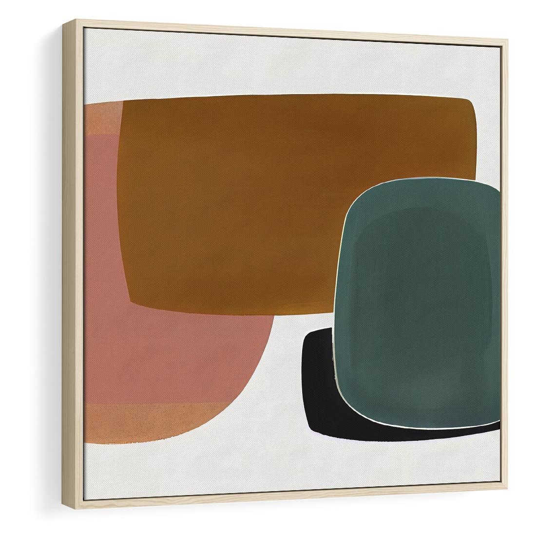 Odkryj wyjątkowy obraz w stylu modern mid-century, prezentujący geometryczne dziwne kształty w harmonii kolorów turkusowego, pudrowego różu i brązowego. Idealny dla pasjonatów sztuki szukających unikalnej dekoracji. Ta abstrakcyjna praca ożywi każde wnętrze, dodając mu odrobinę retro-chic i artystycznego wyrafinowania.