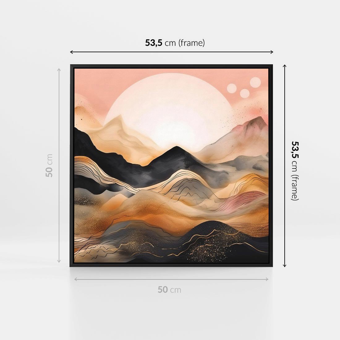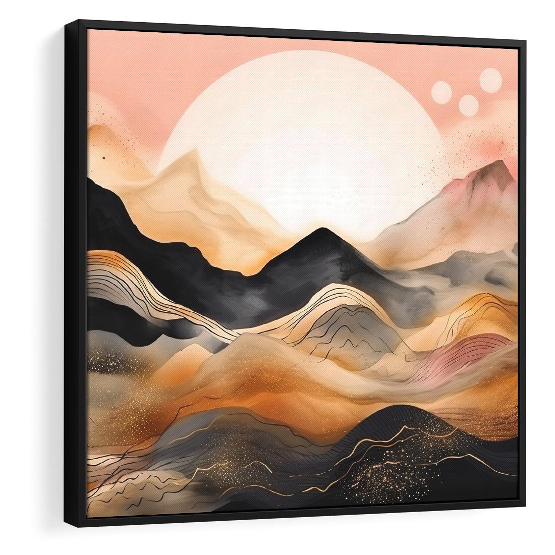 Ta nowoczesna grafika ukazuje urok zachodu słońca nad czarnymi górami. Odcienie pastelowego różu i złota tworzą magiczną atmosferę, przenosząc widza w malowniczy krajobraz. To artystyczne dzieło oddaje piękno natury i wprowadzi harmonię oraz ciepło do każdego wnętrza.