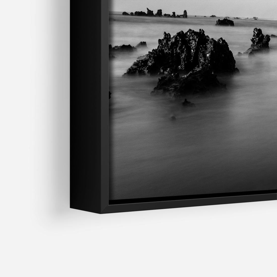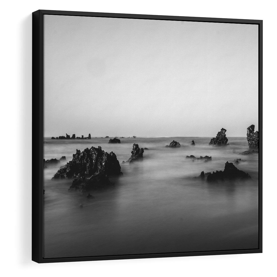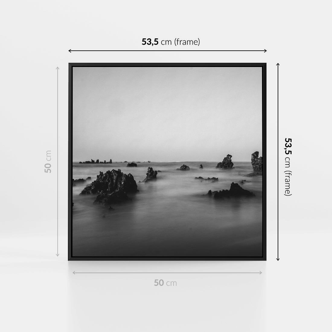 Obraz w ramie 50x50 - Harmonia świateł i cieni - zamglona dzika plaża, skały na plaży - rama czarna