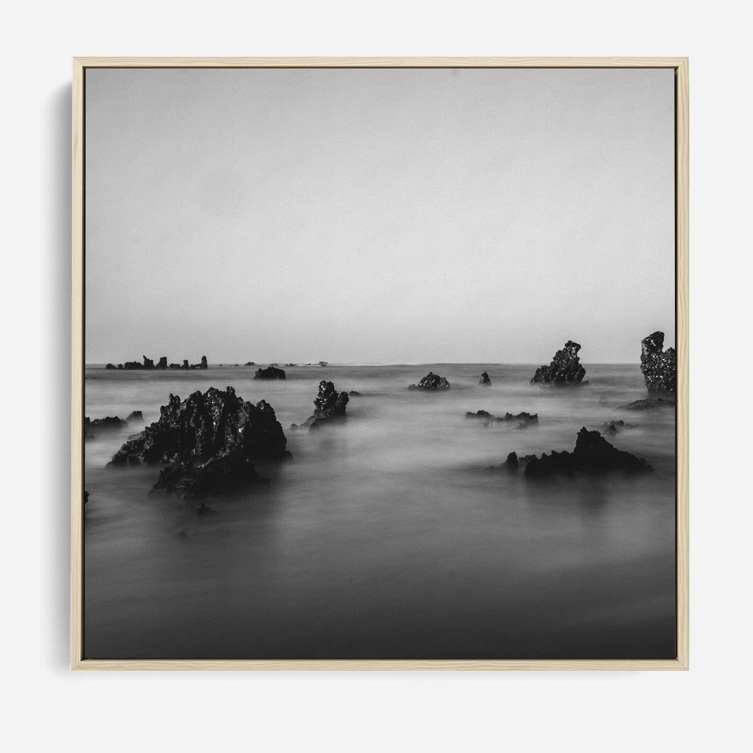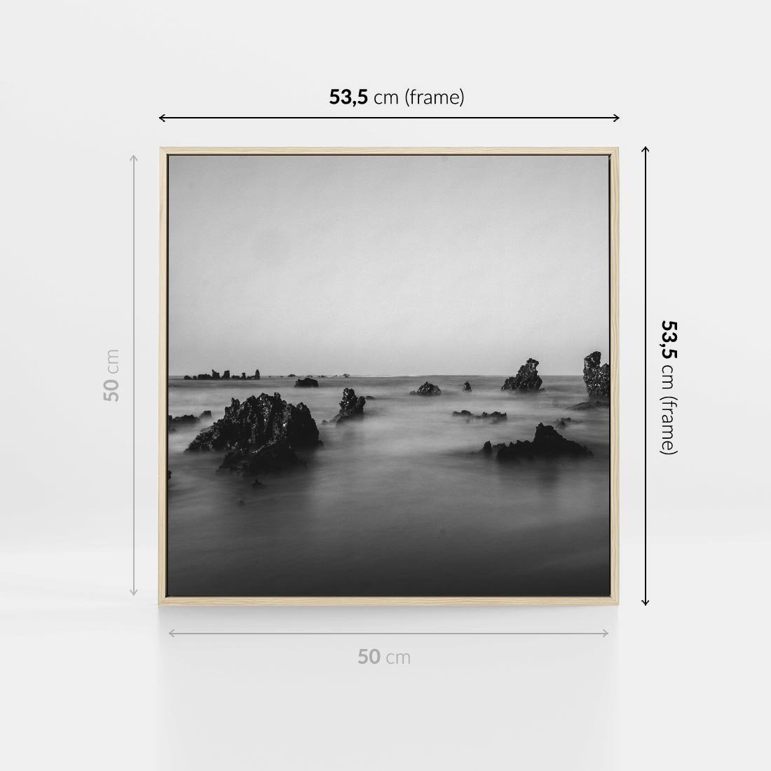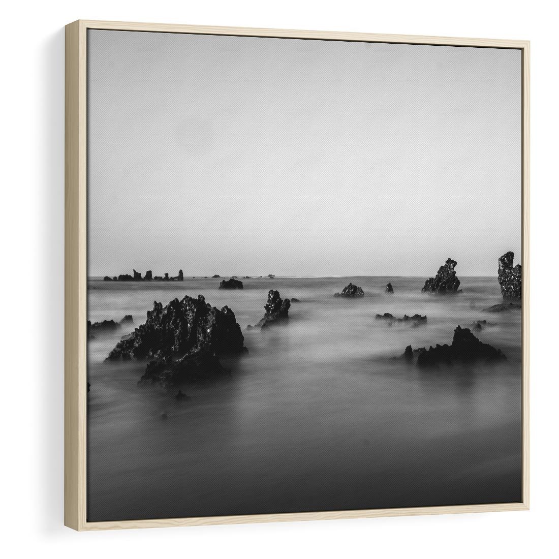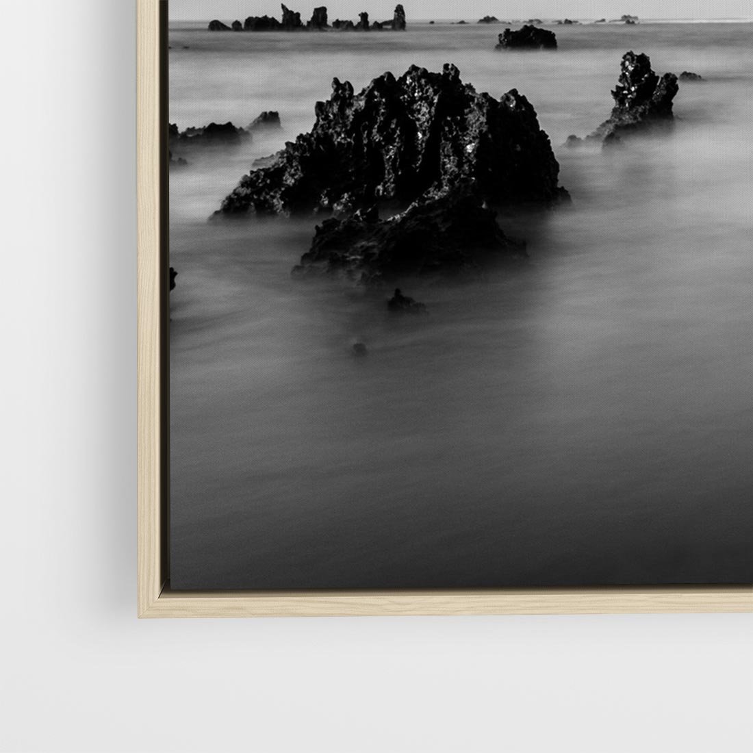 Obraz w ramie 50x50 - Harmonia świateł i cieni - zamglona dzika plaża, skały na plaży - rama drewno