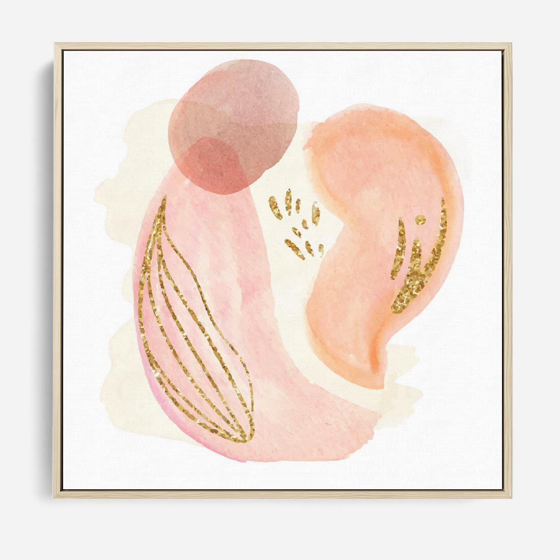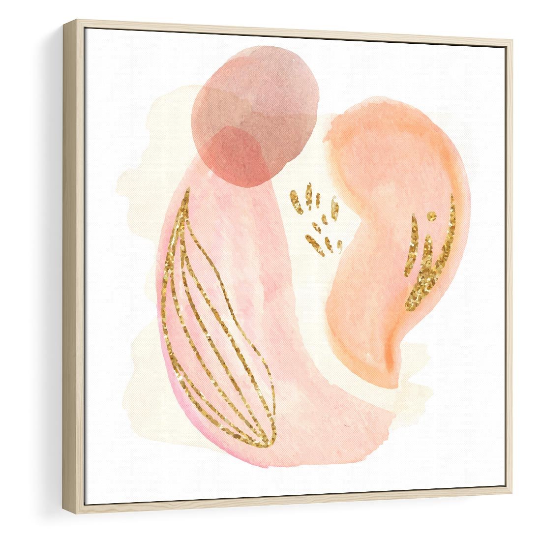 Abstrakcyjne akwarelowe plamy w minimalistycznym stylu. Subtelne pastele złagodzone złotymi elementami tworzą spokojną i wyrafinowaną kompozycję.