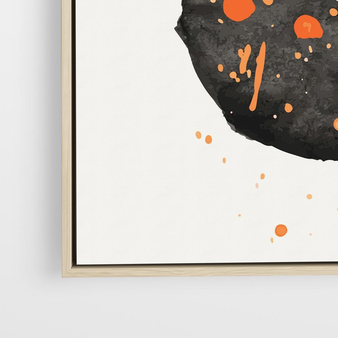 Elegancki obraz o wyrazistej abstrakcyjnej czarnej plamie, ozdobiony rozsianymi pomarańczowymi kropkami. Minimalistyczny styl wzbogacony mocnym akcentem. Sztuka nowoczesna w pełnej harmonii.