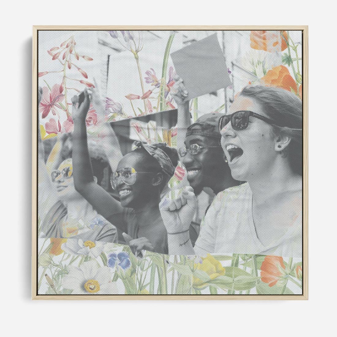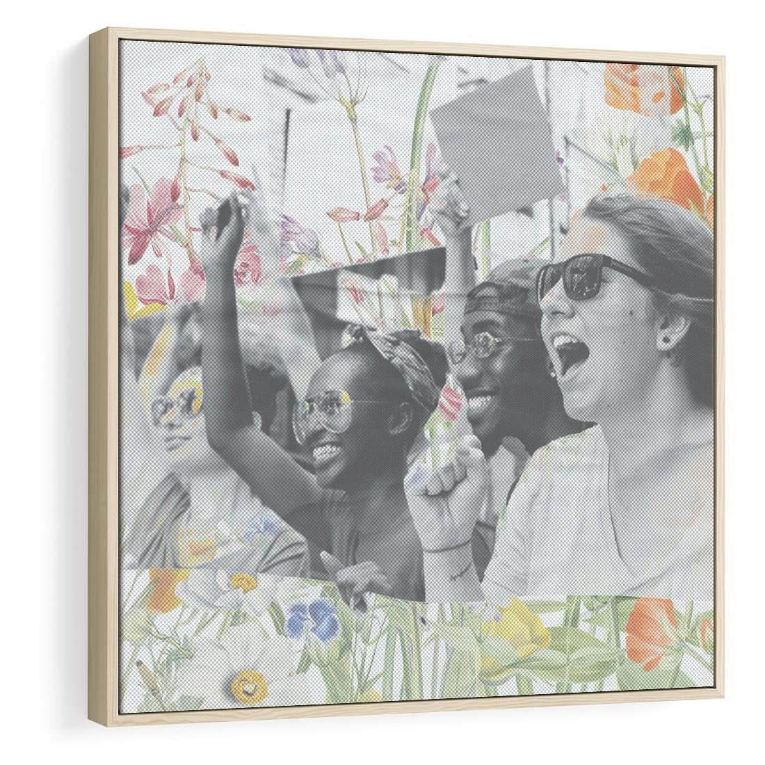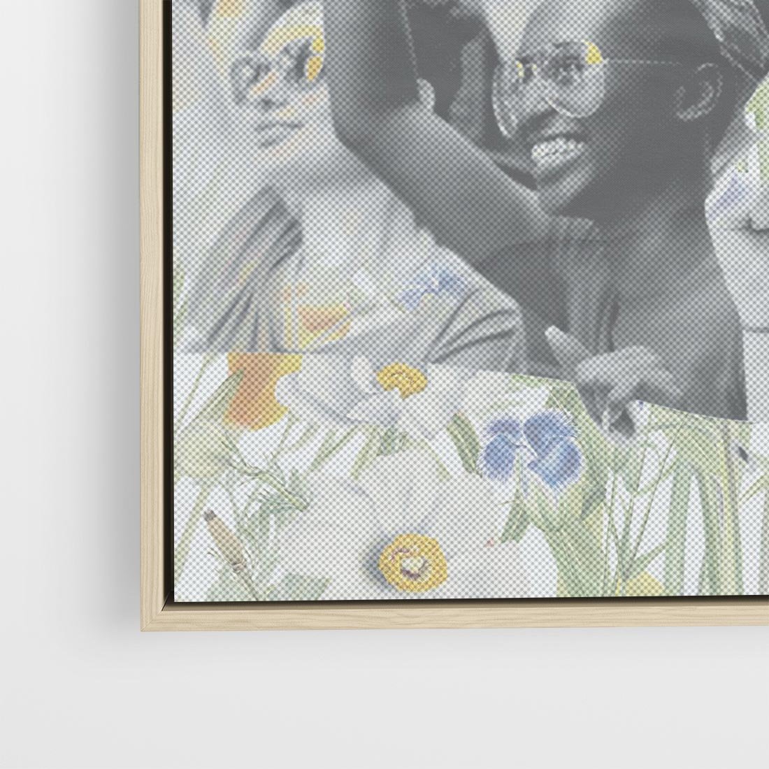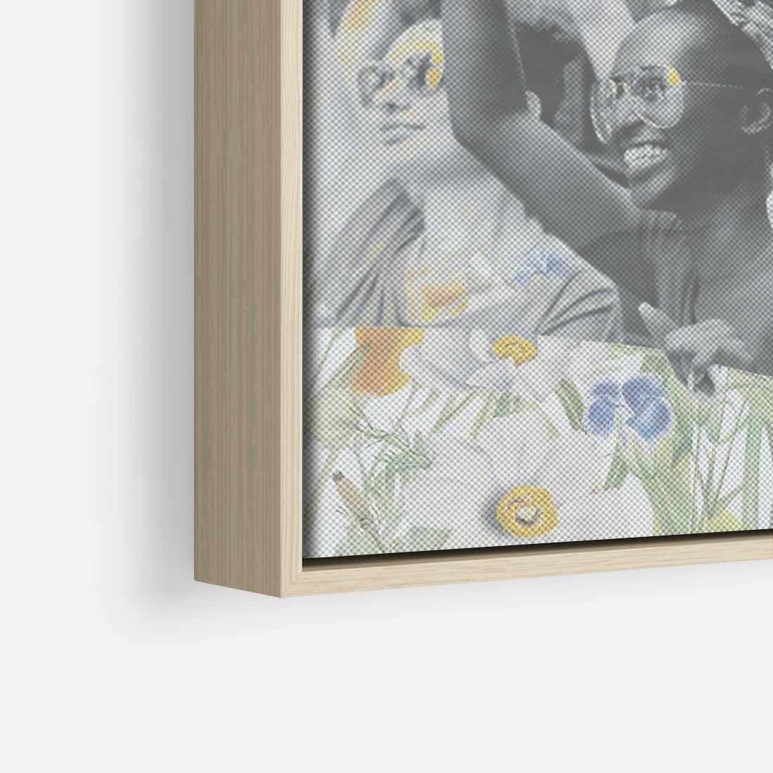 Zapraszamy do odkrycia tego wyjątkowego kolażu, który ukazuje czarno-białe zdjęcie wesołych młodych ludzi, otoczonych tłem z kwiatów retro. Doskonały akcent dla tych, którzy pragną wprowadzić do swoich wnętrz unikalny i radosny wyraz.