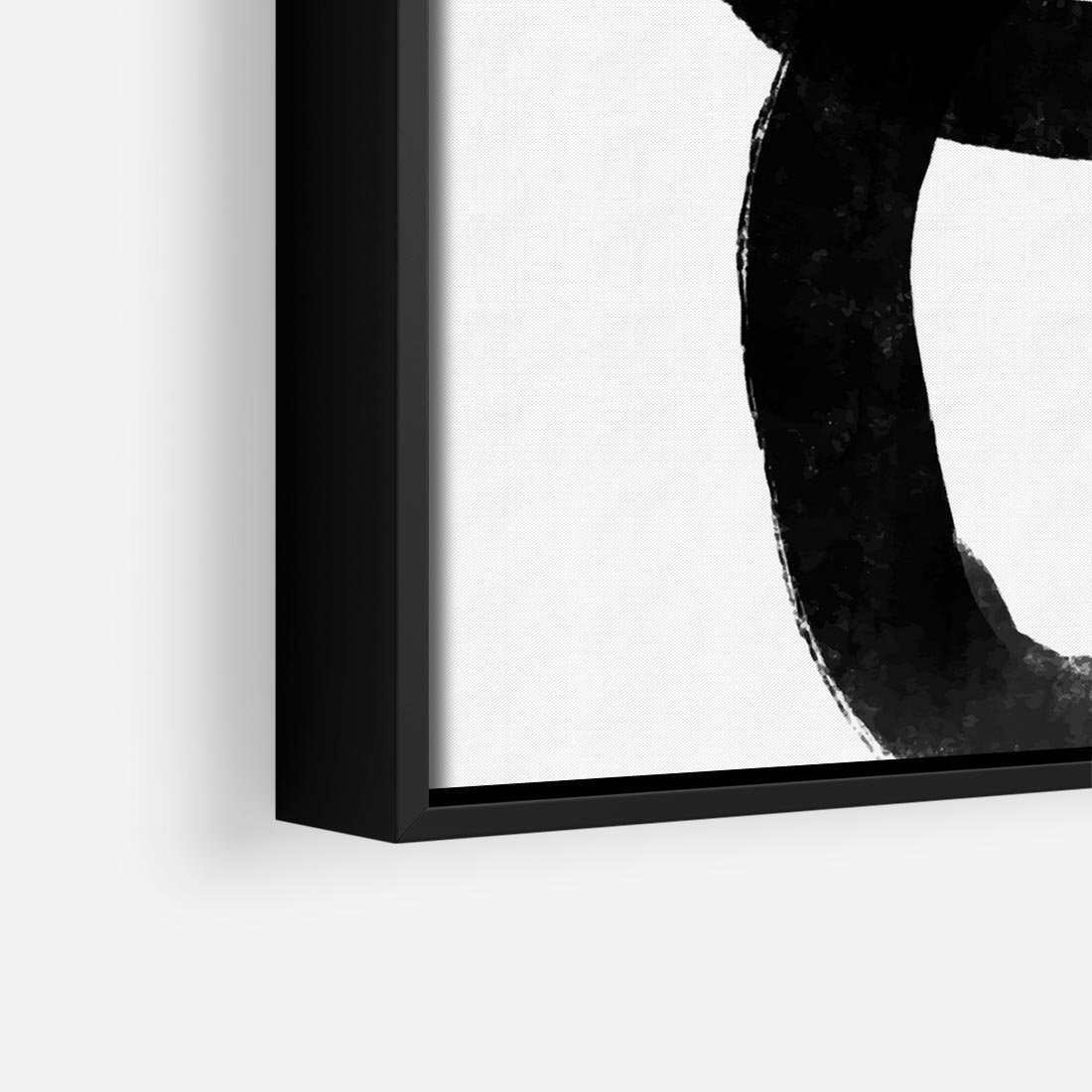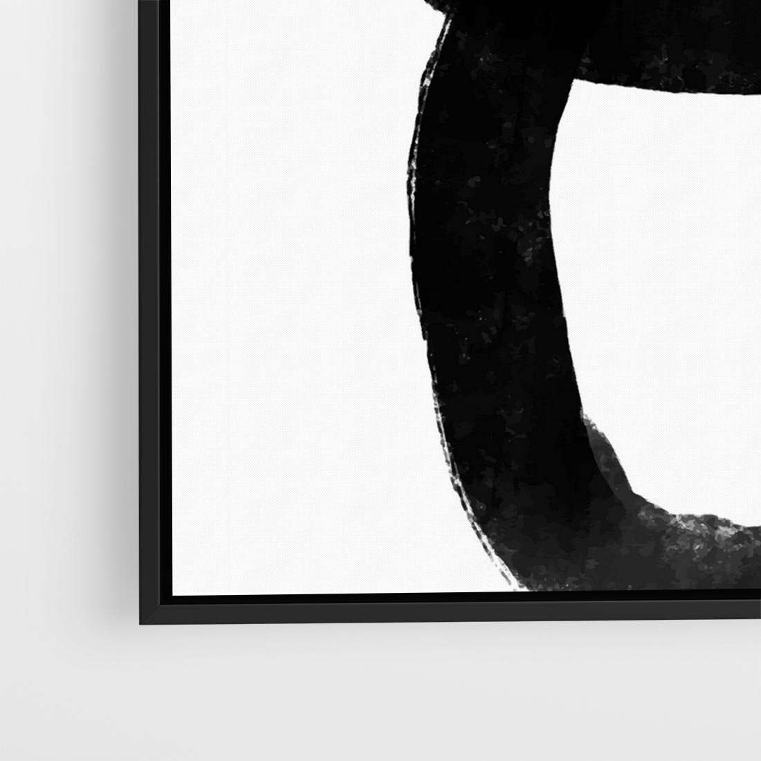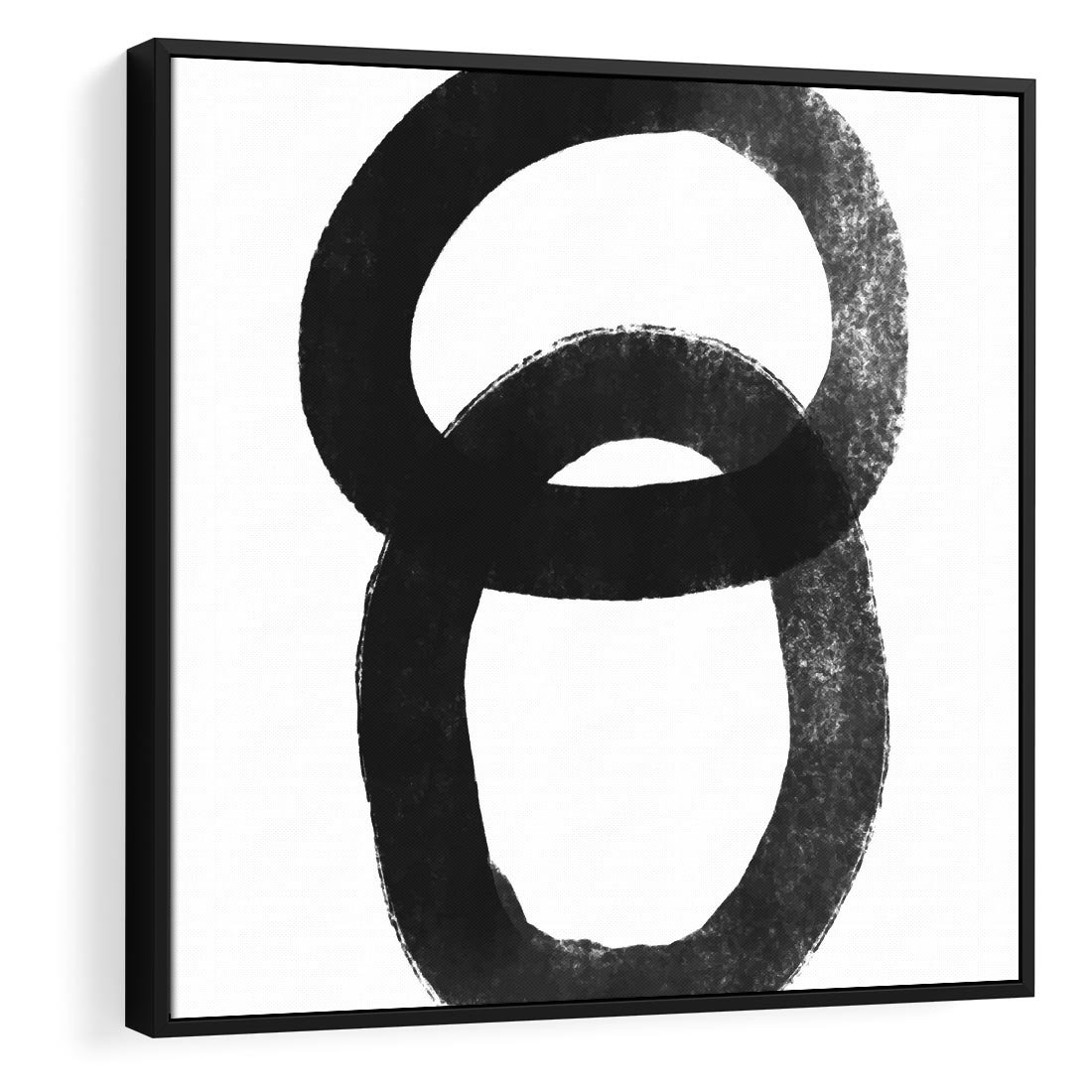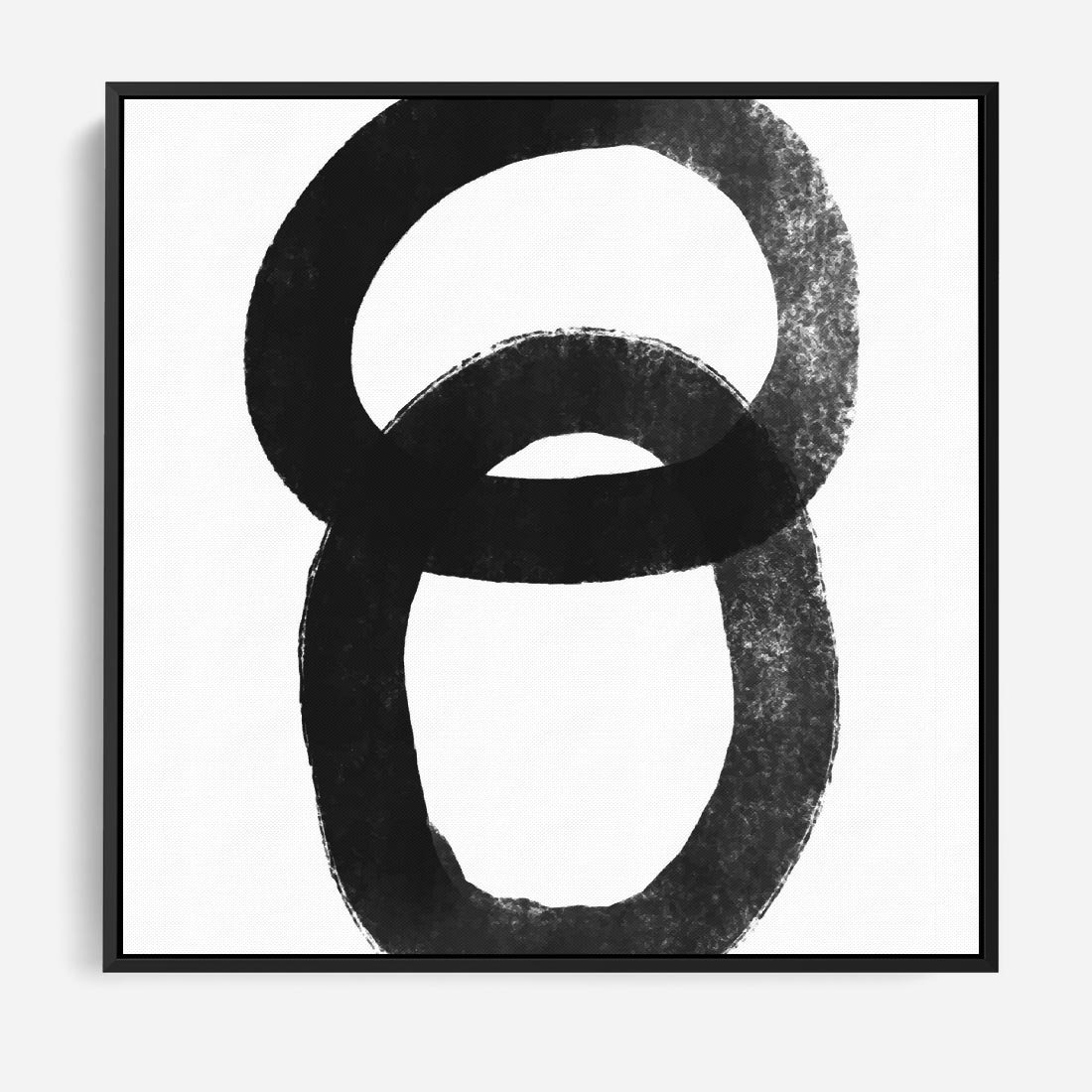 To abstrakcyjne dzieło sztuki w stylu minimalizmu i modern artu prezentuje czarne koła zaplecione w dynamiczną kompozycję. Jego proste, ale wyraziste formy oddają nowoczesny charakter, doskonale pasując do różnych przestrzeni i wzbogacając wnętrza o oryginalność.