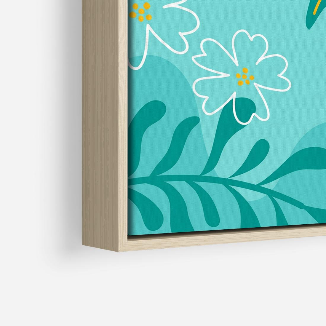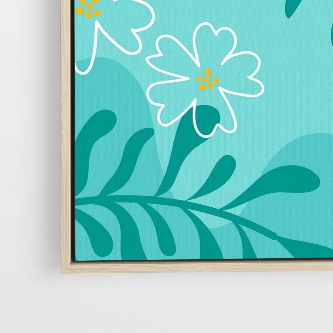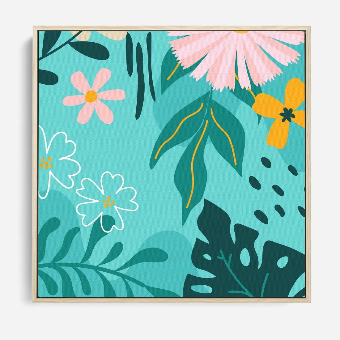 Pastelowa kompozycja z tropikalnymi liśćmi i kwiatami w odcieniach turkusu i różu. To wizualna podróż do tropikalnego raju, dodająca subtelności i koloru Twojej przestrzeni.
