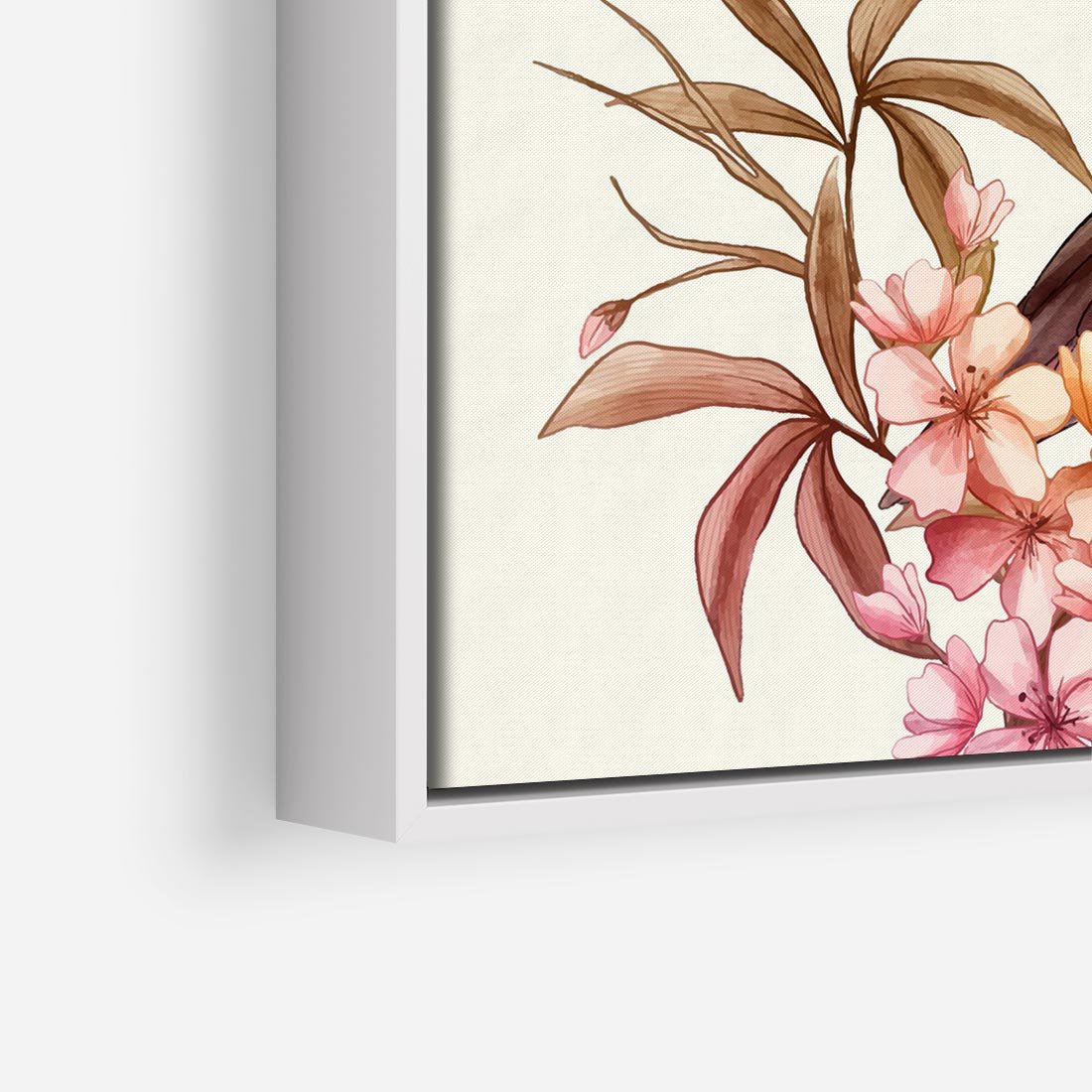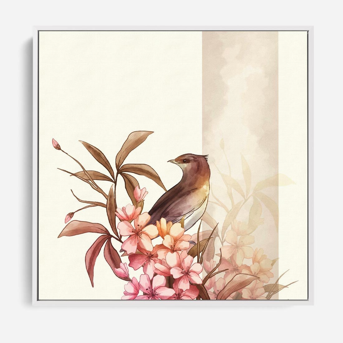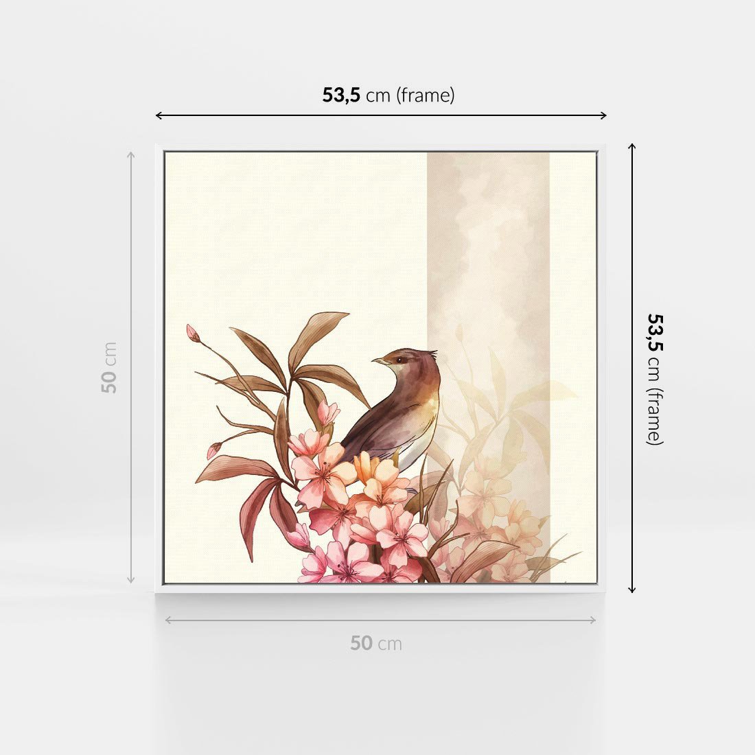 Obraz w ramie 50x50 - Kwiatowe Zanurzenie - japońska sztuka, ptak - rama biała