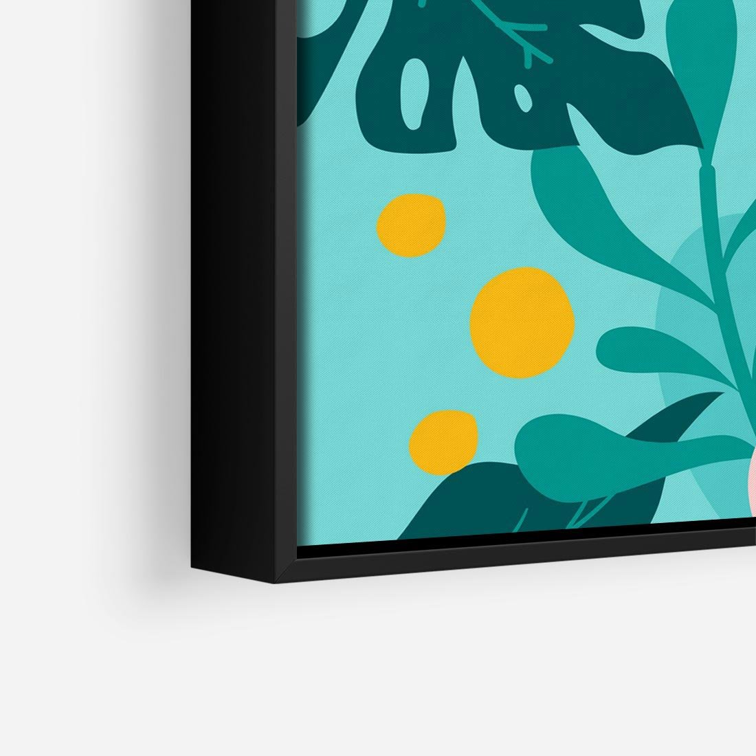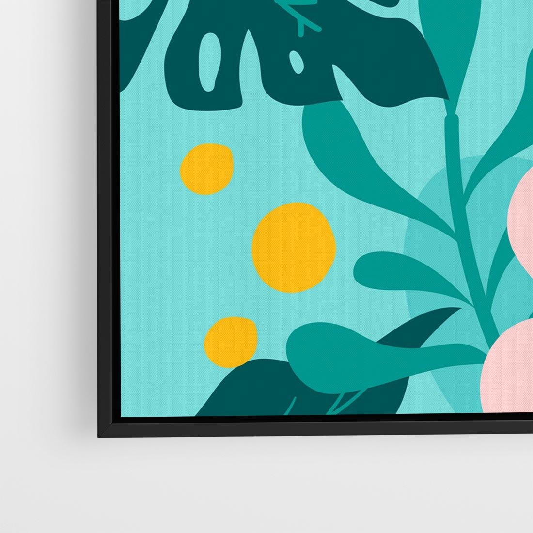 Pastelowa kompozycja wzbogacona kwiatami i tropikalnymi liśćmi w odcieniach turkusu i różu. To artystyczne połączenie natury i delikatności, tworzące harmonijną atmosferę.