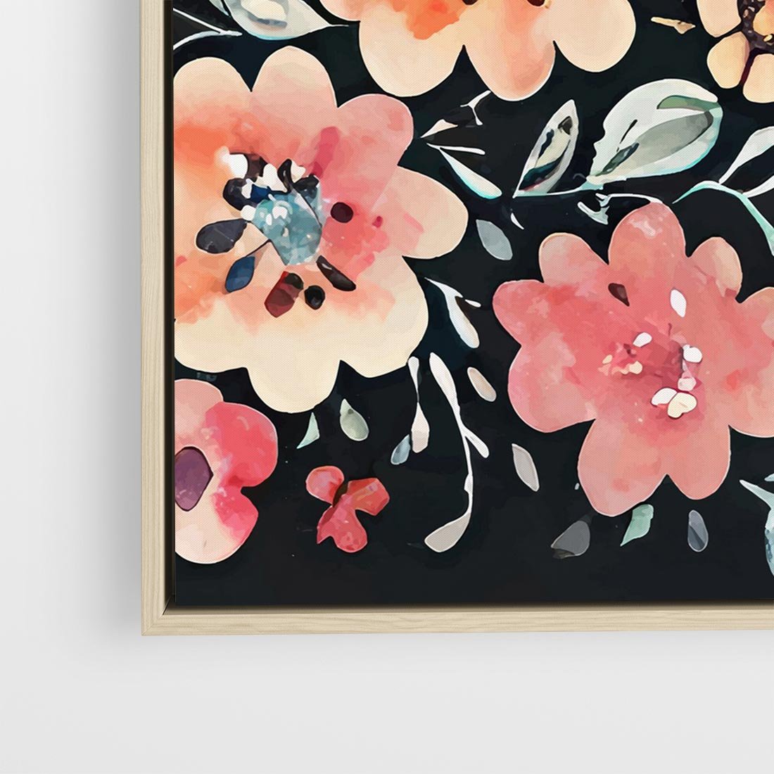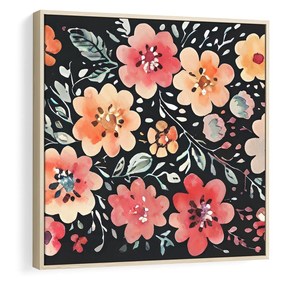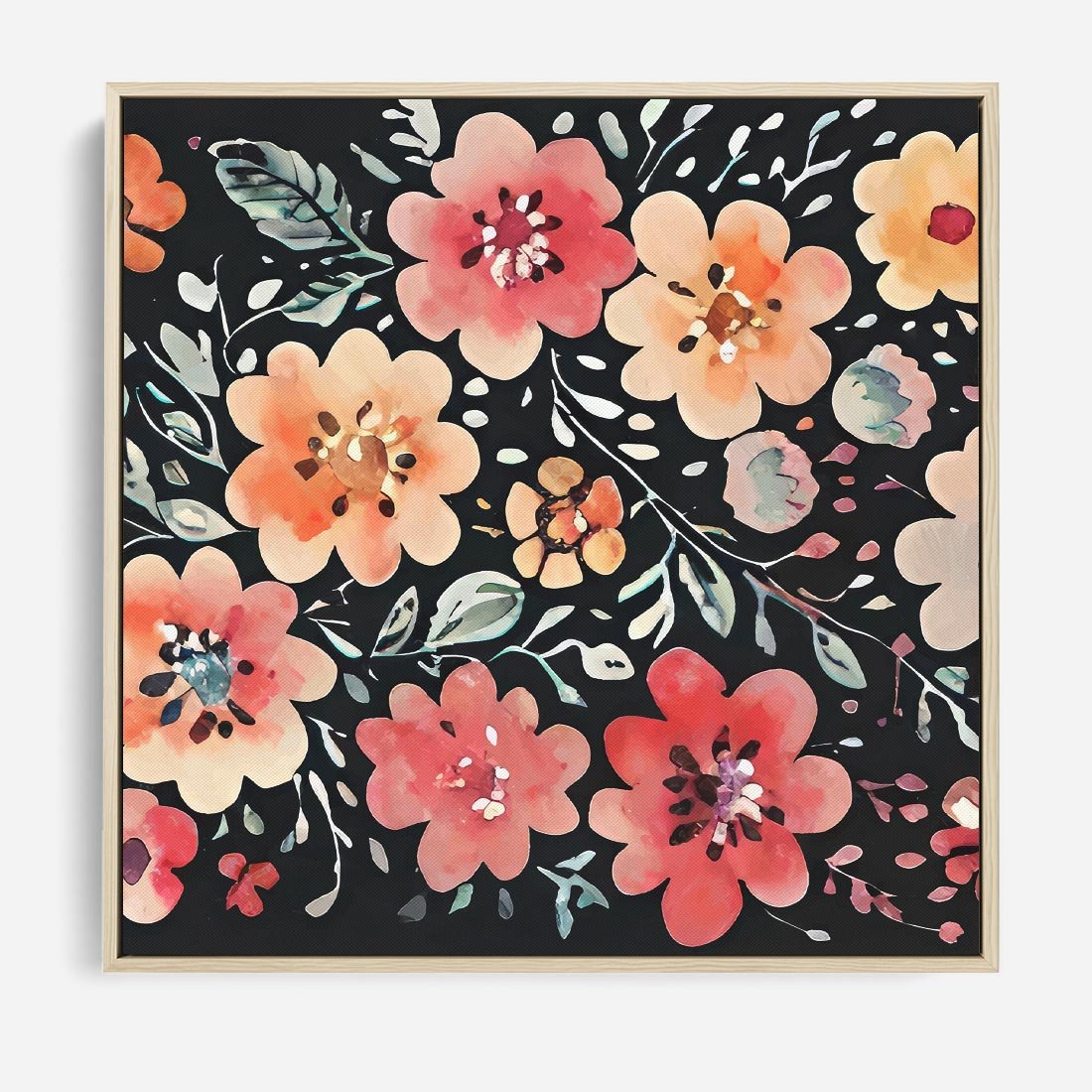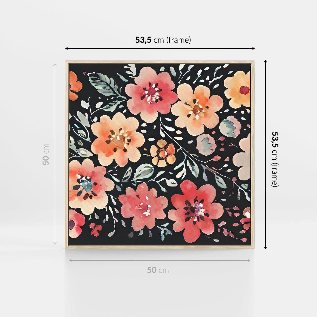 Obraz w ramie 50x50 - Labirynty melancholii - akwarelowe, pastelowe kwiaty na czarnym tle - rama drewno