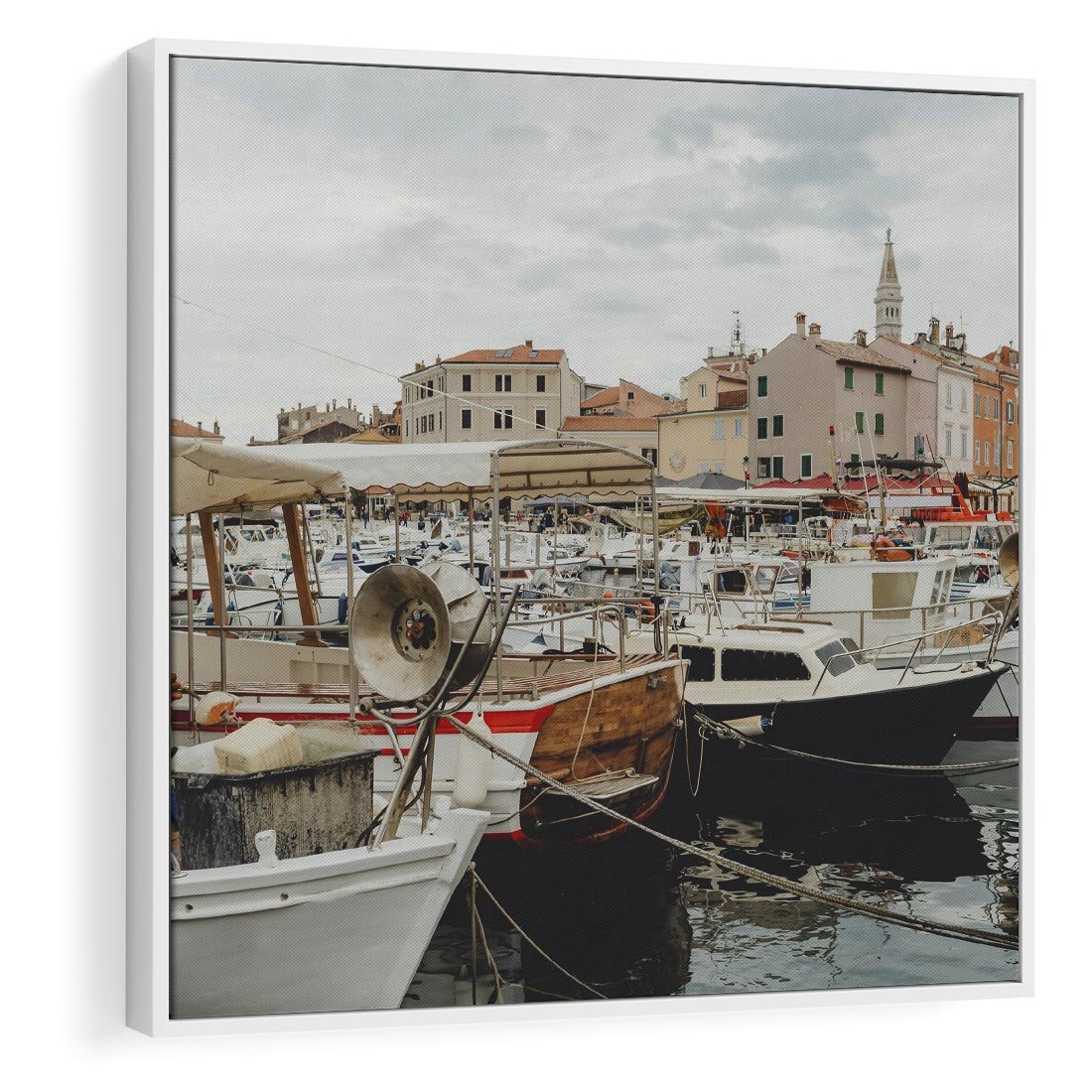 Obraz w ramie 50x50 - Malowniczy Krajobraz Morski - morze, łódki - rama biała