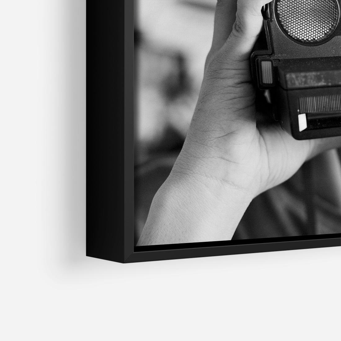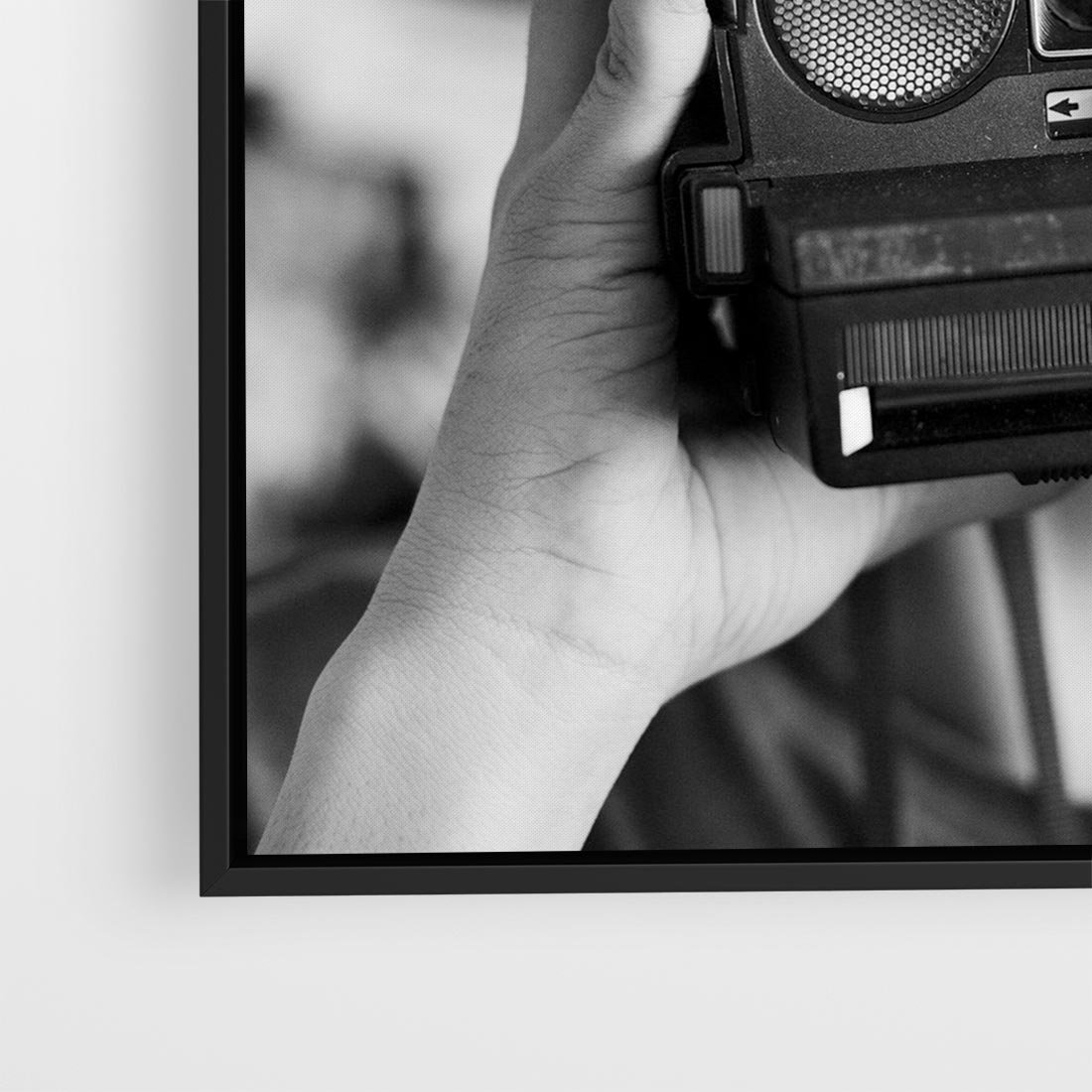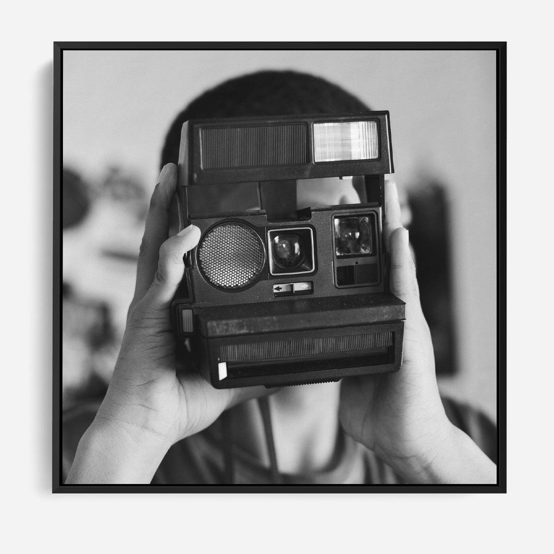 Czarno-biały portret przedstawia mężczyznę, który robi zdjęcie, używając polaroidu. Fotografia emanuje artystycznym wdziękiem, a klimat retro dodaje jej wyjątkowego charakteru. Ten obraz przenosi nas w świat sztuki i fotografii, wzbudzając zainteresowanie i ciekawość. Idealny dodatek do wnętrz, które pragną zachować artystyczną duszę.