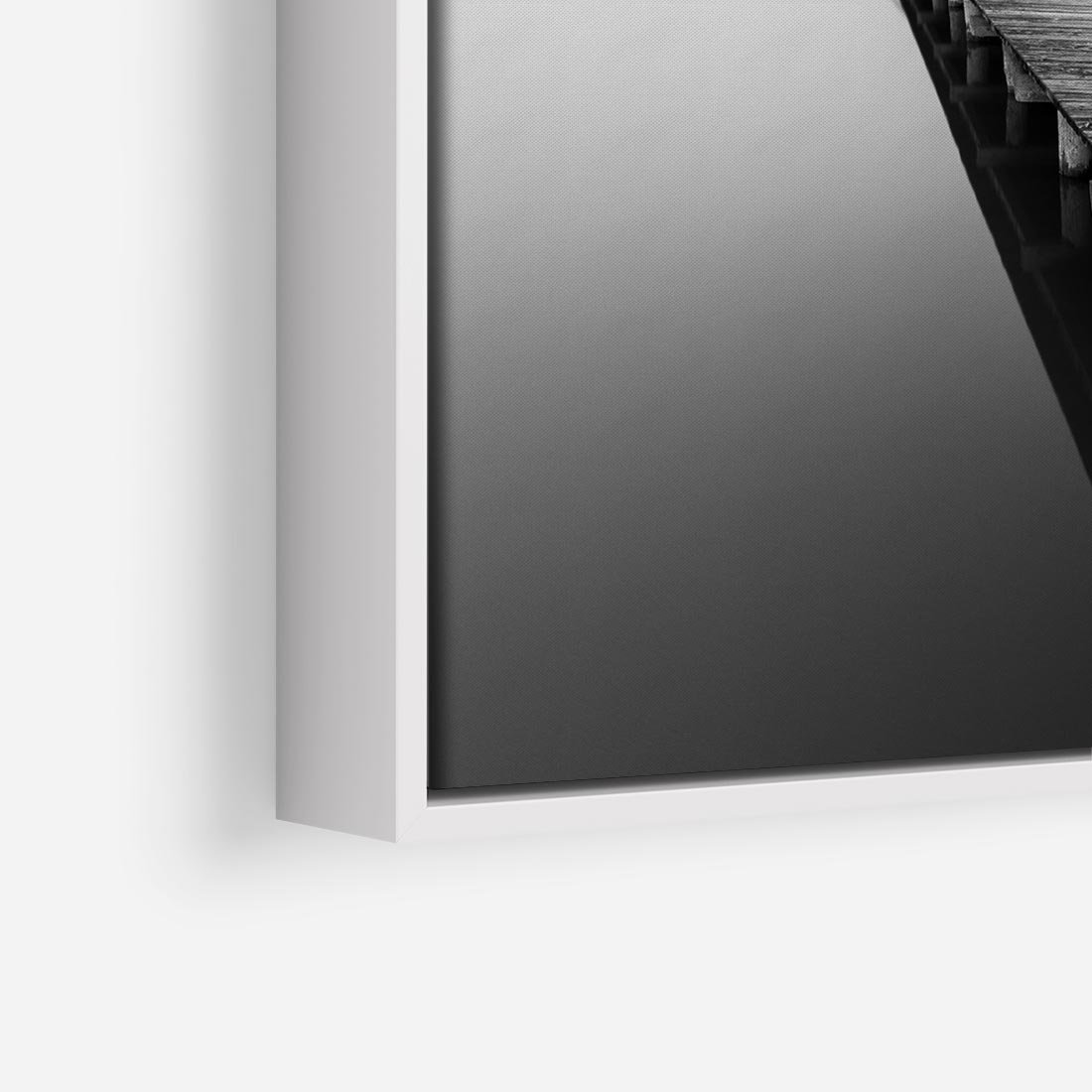 Obraz w ramie 50x50 - Mglista Perspektywa - czarno biała fotografia, drewniany pomost na jeziorze - rama biała
