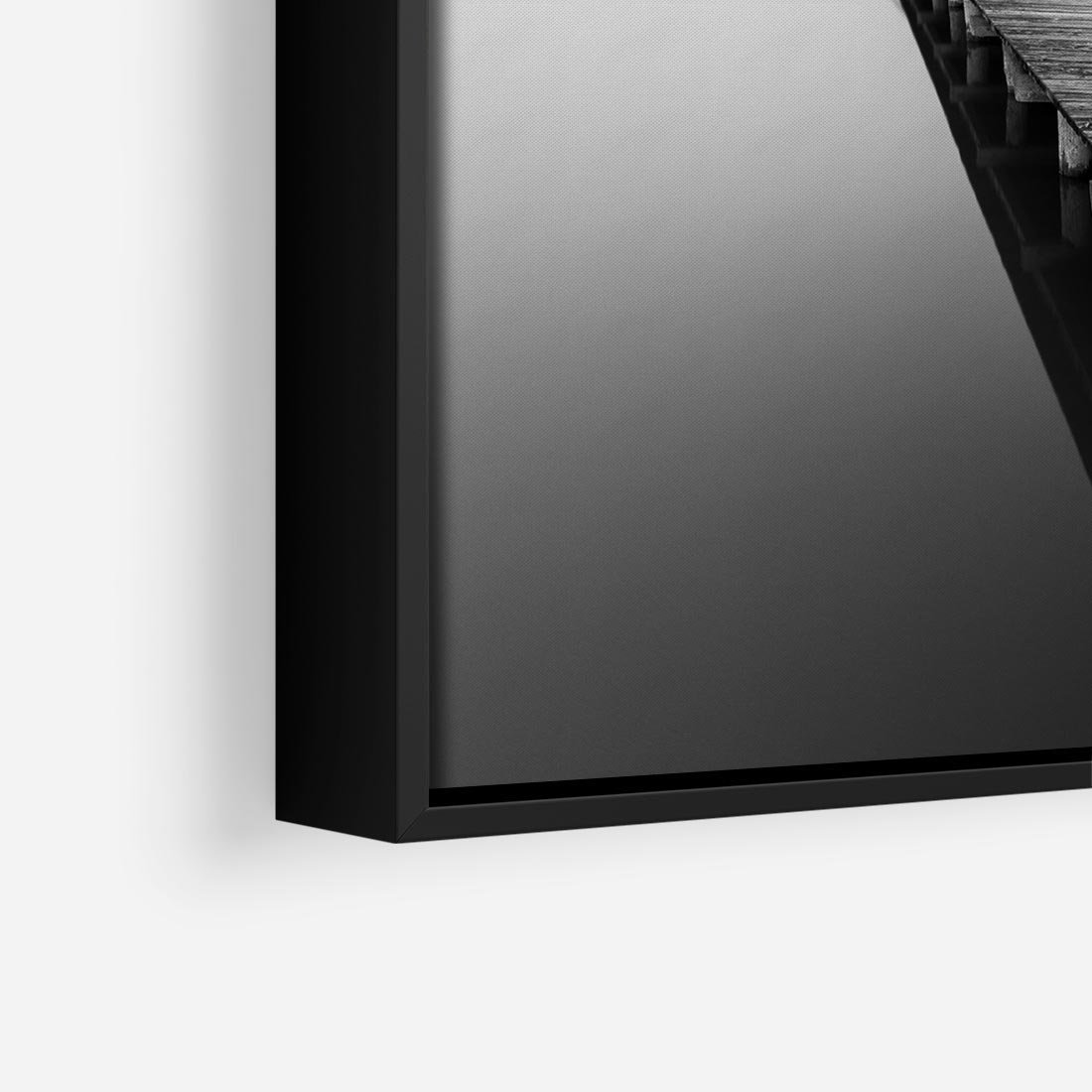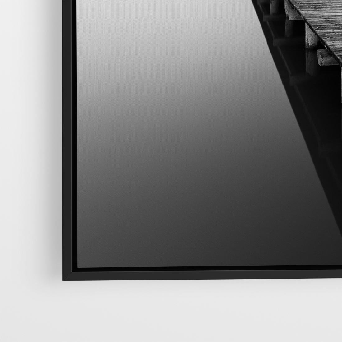 Obraz w ramie 50x50 - Mglista Perspektywa - czarno biała fotografia, drewniany pomost na jeziorze - rama czarna