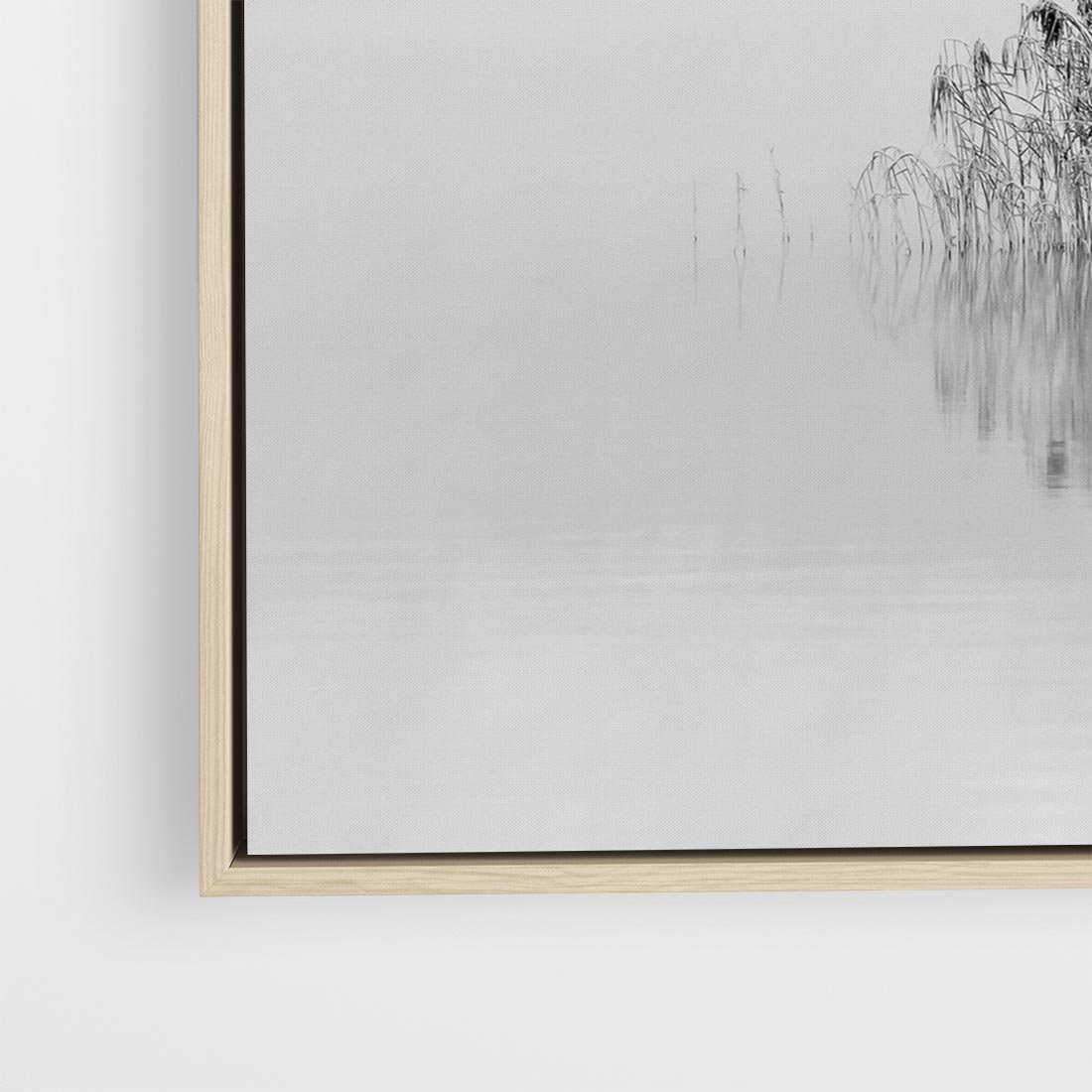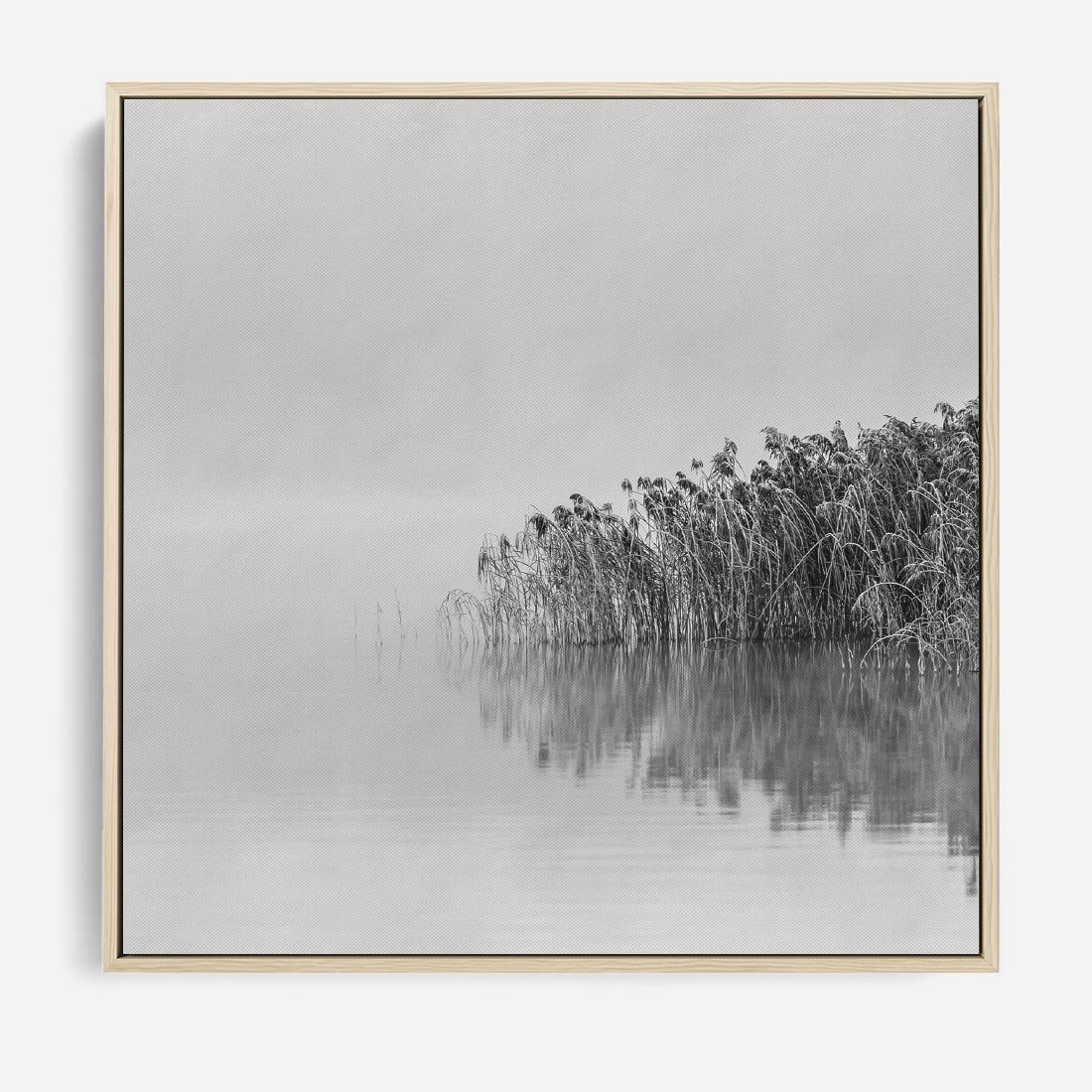 Obraz w ramie 50x50 - Mglisty Brzeg Jeziora - czarno białe zdjęcie, zamglone jezioro - rama drewno