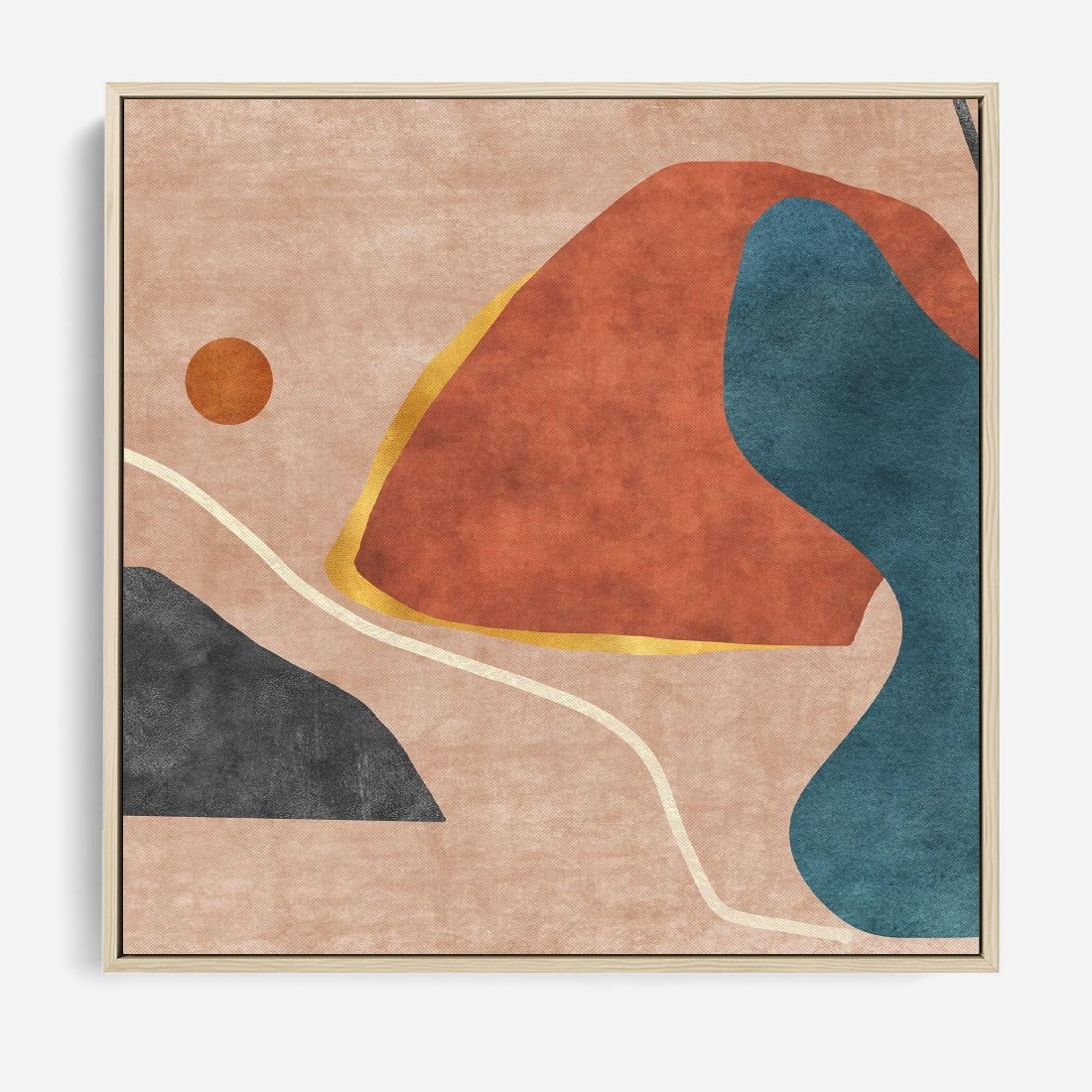 Ten nowoczesny obraz na płótnie łączy abstrakcyjne kształty, miedziany kolor i wyraziste plamy turkusu, tworząc wyjątkową kompozycję. Przypadkowe linie i beżowe tło dodają harmonii i elegancji, sprawiając, że dzieło jest niepowtarzalne.