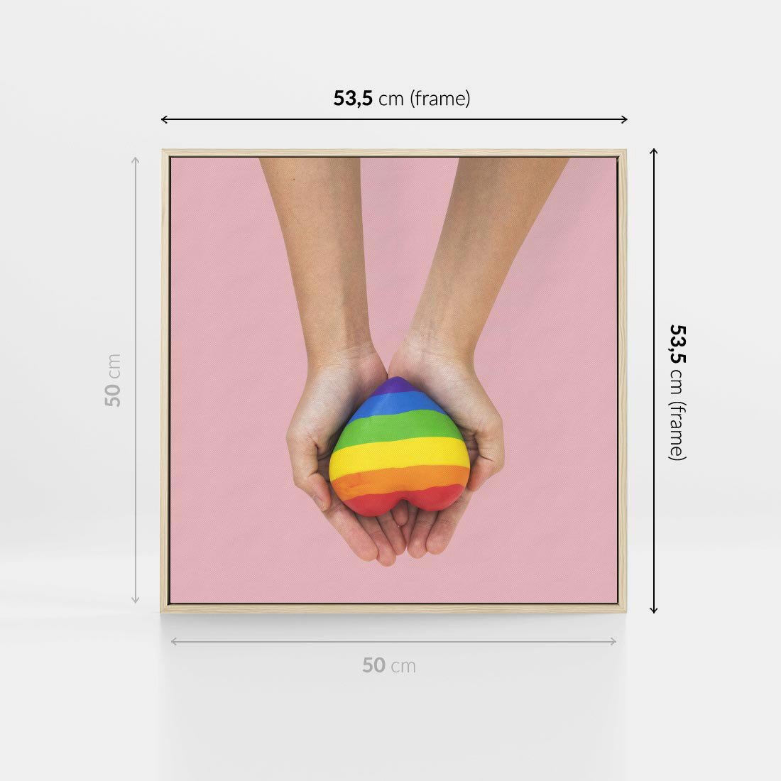 Obraz w ramie 50x50 - Miłość na Dłoniach - zdjęcie, dłonie trzymają ulepione tęczowe serce - rama drewno