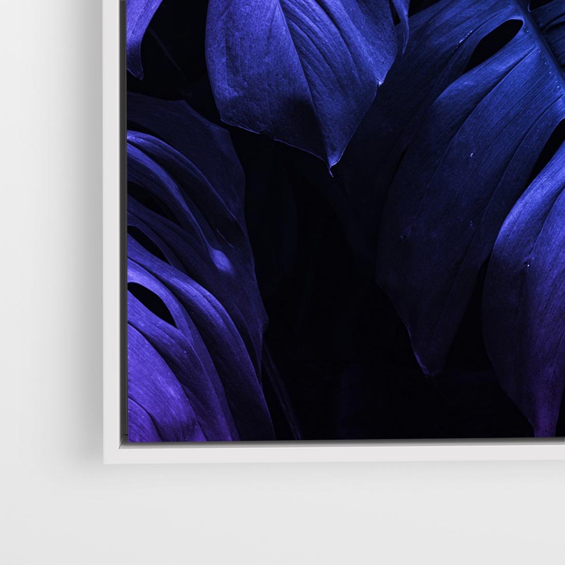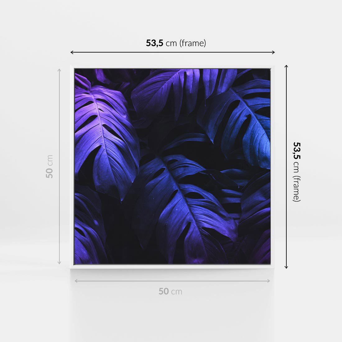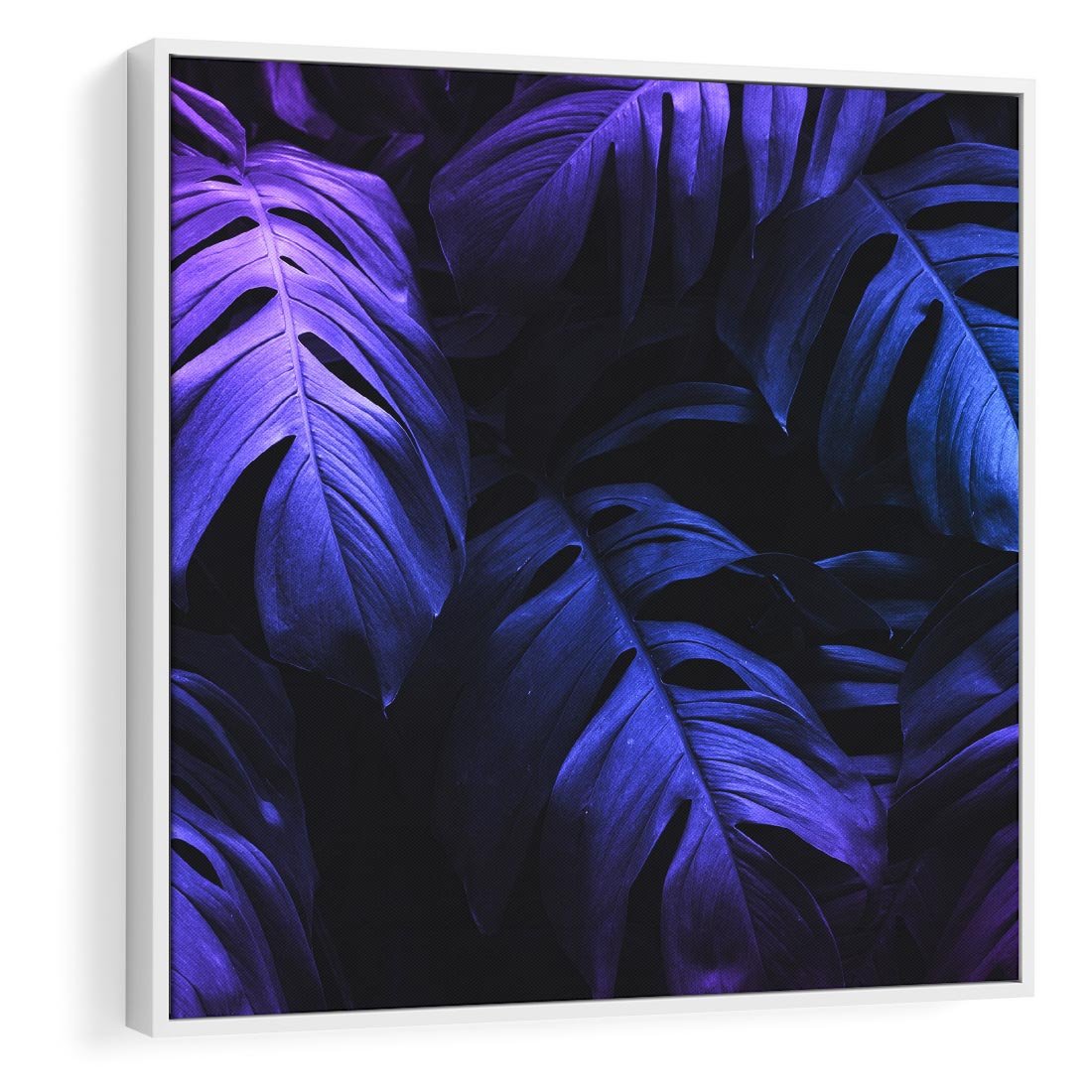 Obraz w ramie 50x50 - Mroczna Magia Dżungli - mroczna grafika, fioletowe liście monstery na czarnym tle - rama biała