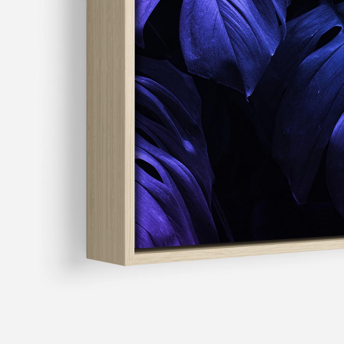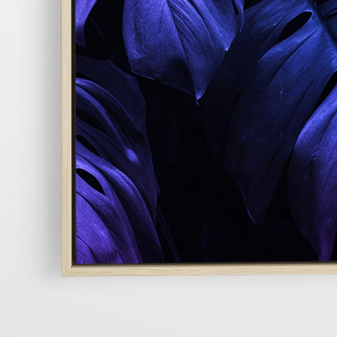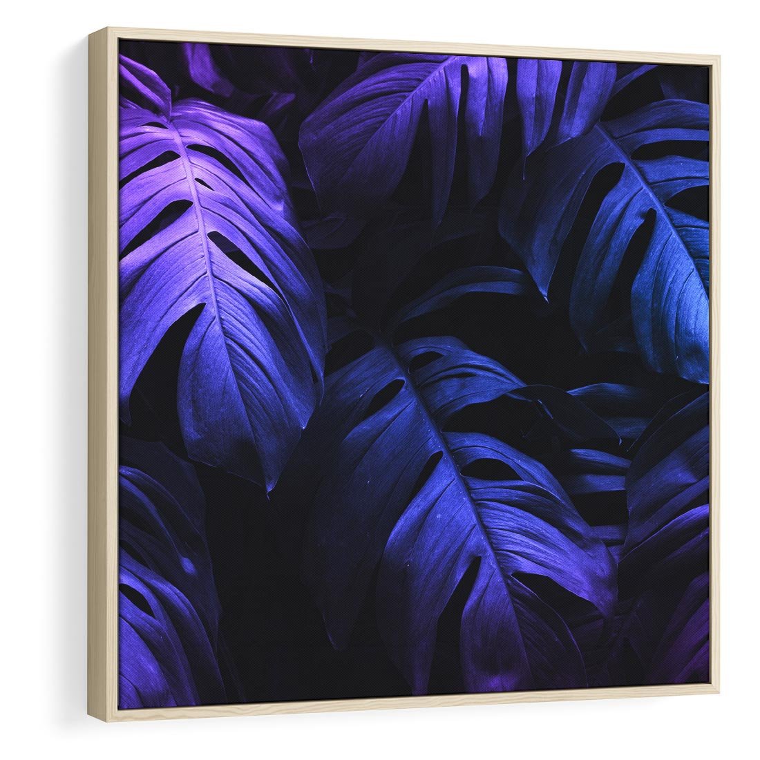 Obraz w ramie 50x50 - Mroczna Magia Dżungli - mroczna grafika, fioletowe liście monstery na czarnym tle - rama drewno