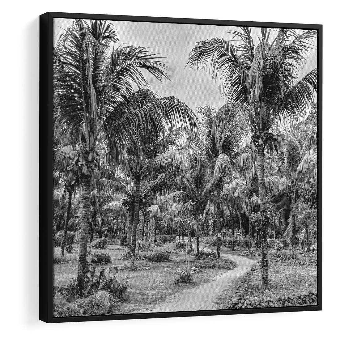 Obraz w ramie 50x50 - Mroczna Ścieżka Tropików - czarno biała fotografia, ścieżka pośród palm - rama czarna