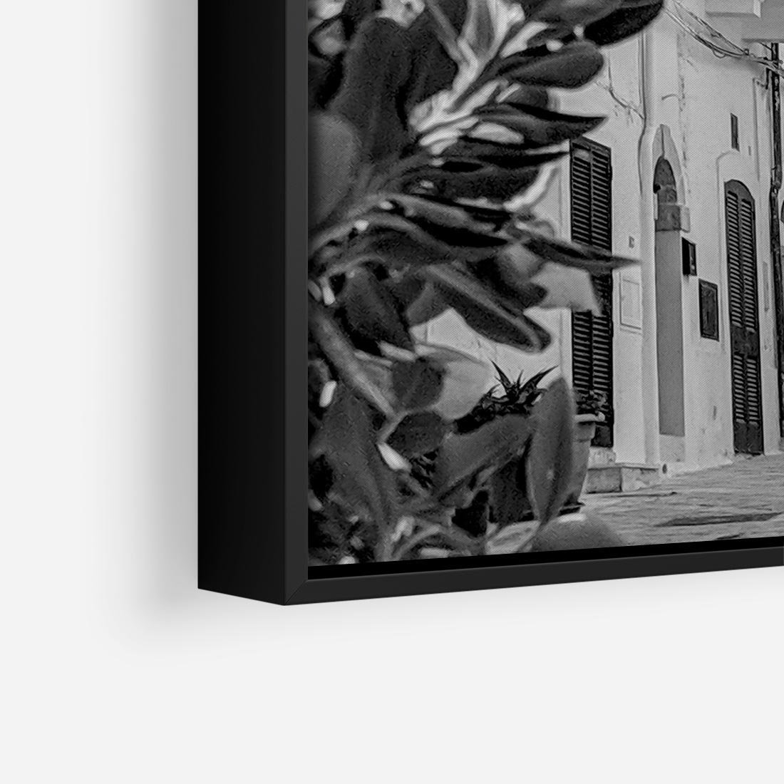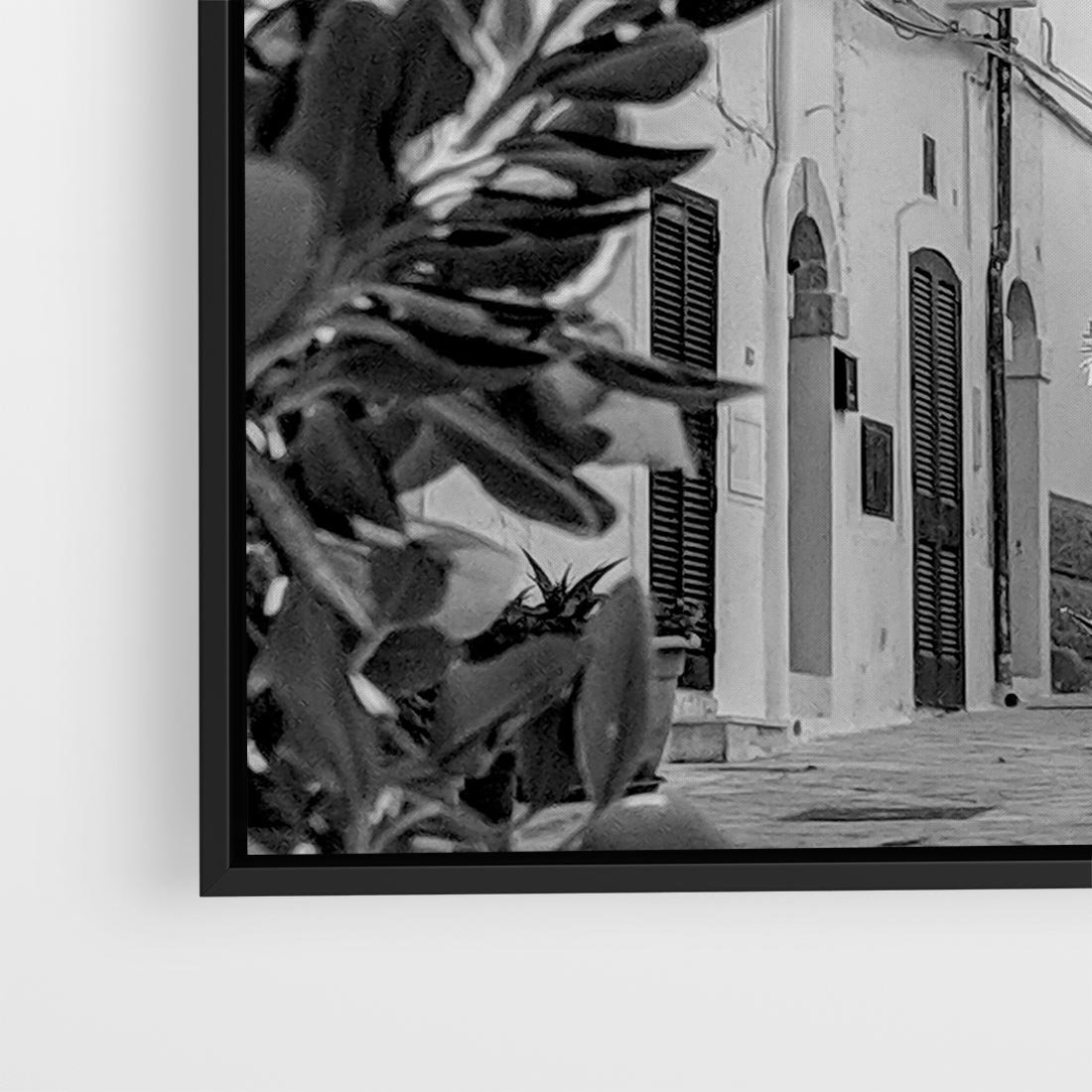 To czarno-białe zdjęcie przedstawia urokliwą uliczkę w nadmorskim mieście na południu Europy, być może we Włoszech lub Grecji. Ulica wydaje się być spokojnym zakątkiem, gdzie kamienne budynki sąsiadują ze sobą, tworząc malowniczą scenerię. Zdjęcie oddaje urok historycznej architektury i atmosferę tego miejsca, a brak kolorów skupia uwagę na detalach i strukturach budynków oraz uliczki. To idealna dekoracja dla miłośników kultury śródziemnomorskiej i romantycznych krajobrazów.