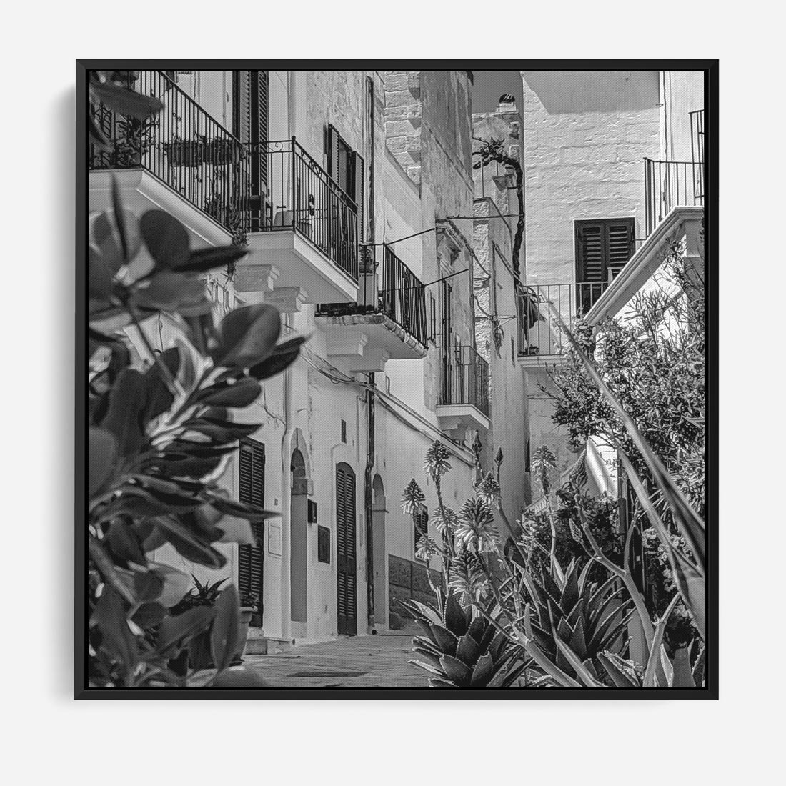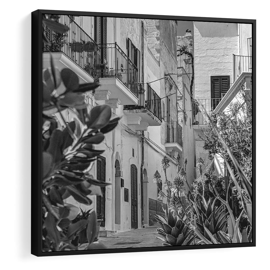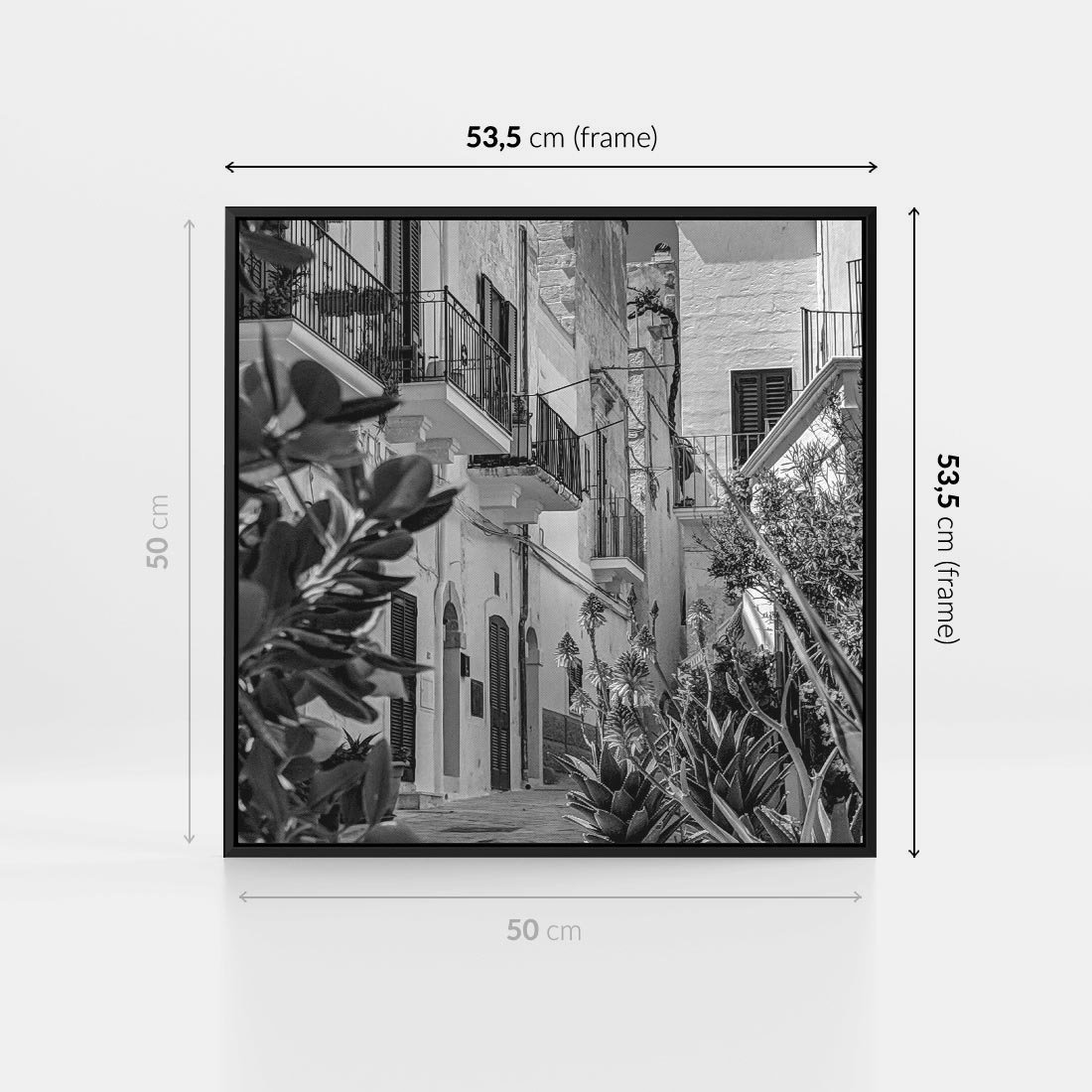 Obraz w ramie 50x50 - Nadmorska Uliczka - czarno białe zdjecie, uliczka w nadmorskim mieście - rama czarna