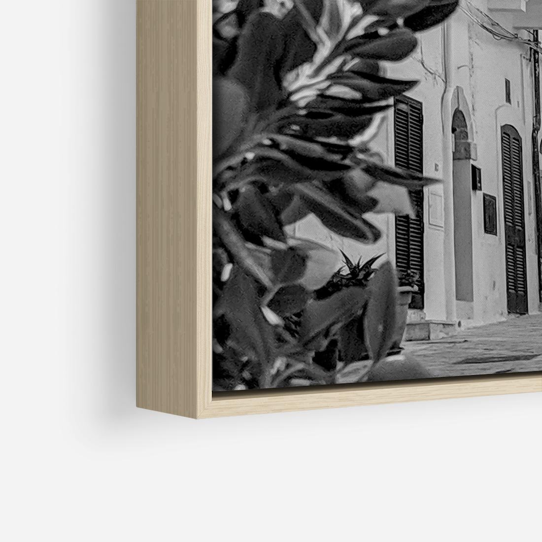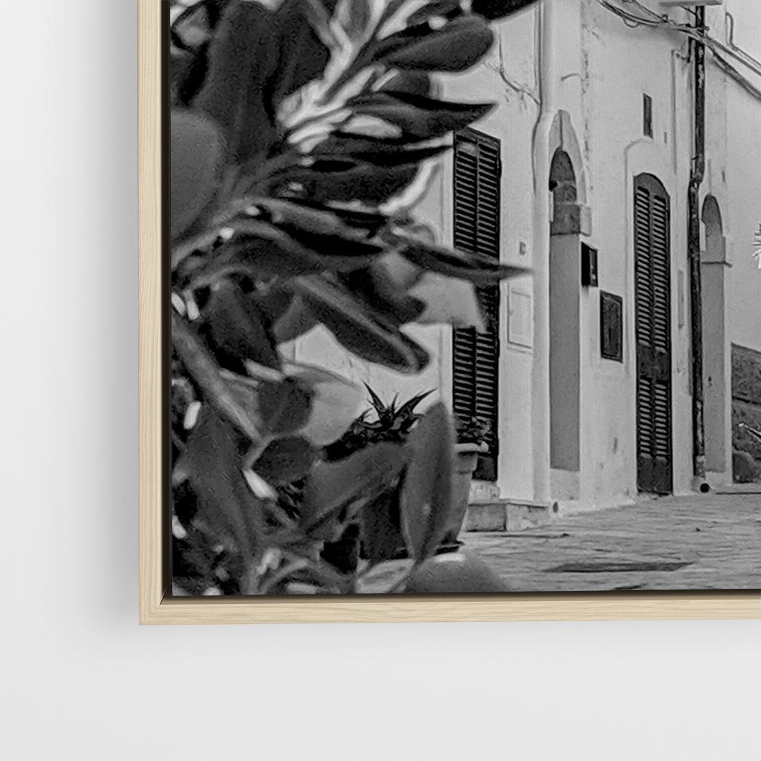 To czarno-białe zdjęcie przedstawia urokliwą uliczkę w nadmorskim mieście na południu Europy, być może we Włoszech lub Grecji. Ulica wydaje się być spokojnym zakątkiem, gdzie kamienne budynki sąsiadują ze sobą, tworząc malowniczą scenerię. Zdjęcie oddaje urok historycznej architektury i atmosferę tego miejsca, a brak kolorów skupia uwagę na detalach i strukturach budynków oraz uliczki. To idealna dekoracja dla miłośników kultury śródziemnomorskiej i romantycznych krajobrazów.