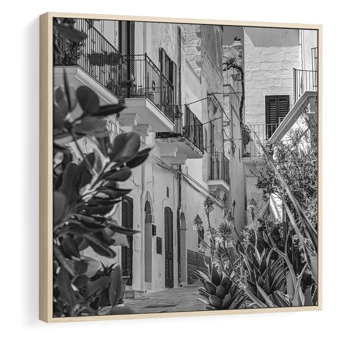 Obraz w ramie 50x50 - Nadmorska Uliczka - czarno białe zdjecie, uliczka w nadmorskim mieście - rama drewno
