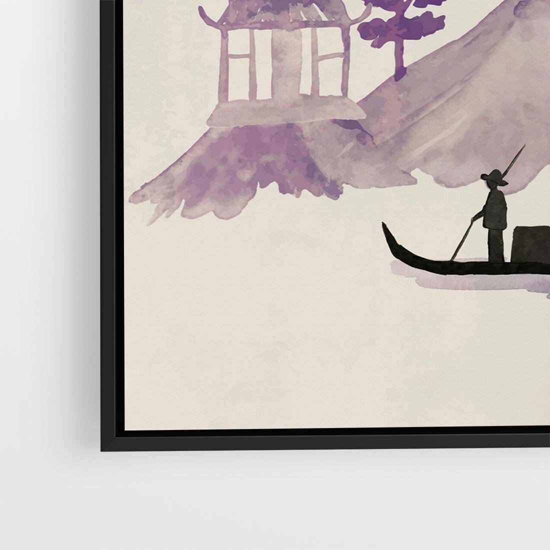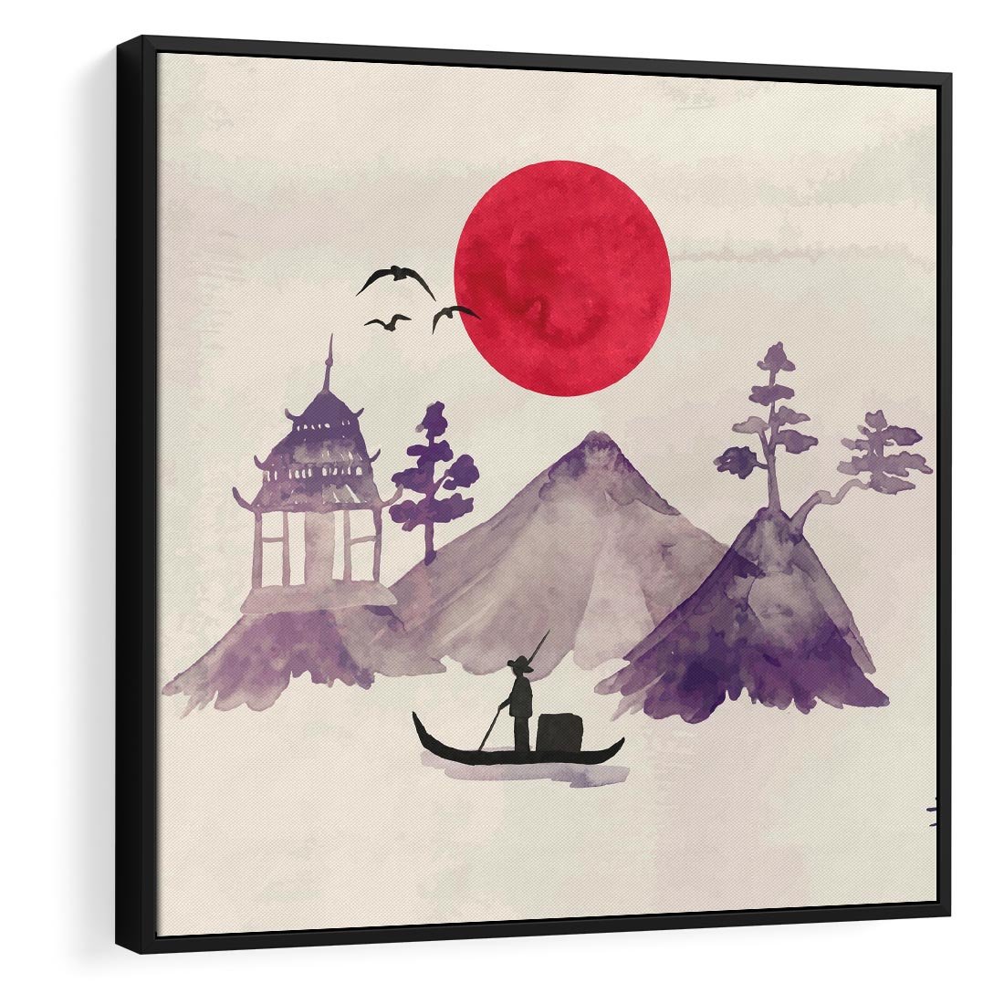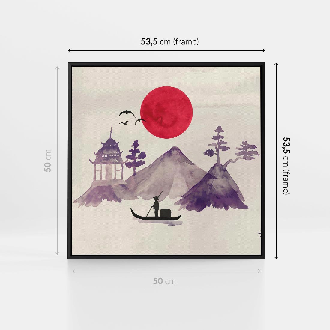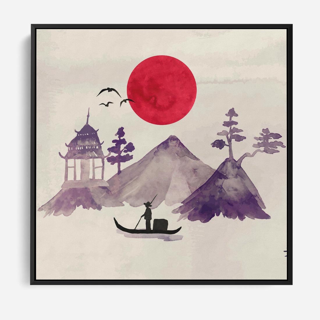 Ta urocza akwarela ukazuje japońską łódź na spokojnym jeziorze, z czerwonym słońcem na horyzoncie. Sztuka emanuje harmonią i spokojem, charakterystycznymi dla japońskiej sztuki. Przenosząc nas w magiczny świat natury, obraz ukazuje urok przyrody i zachodu słońca.
