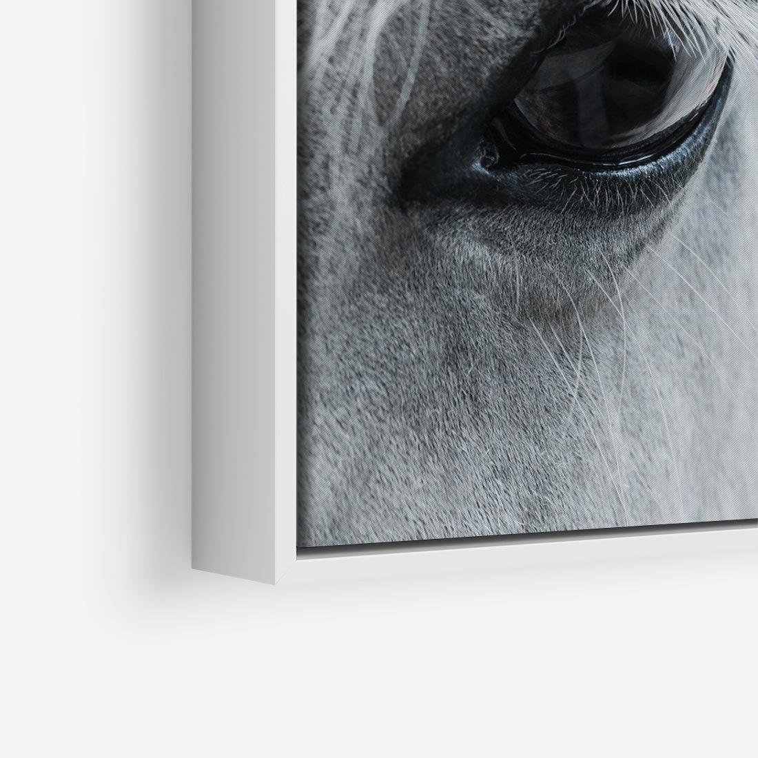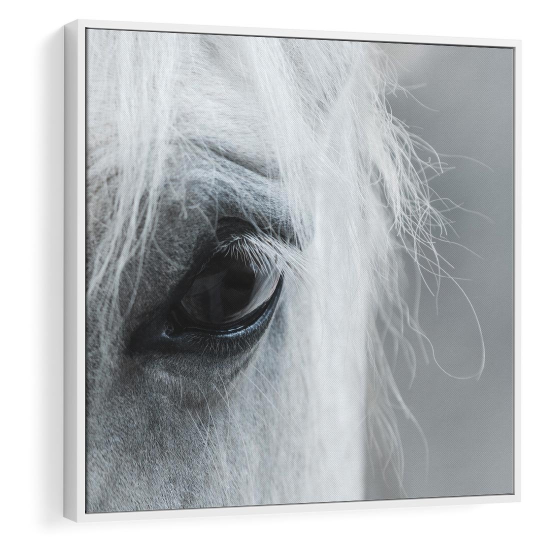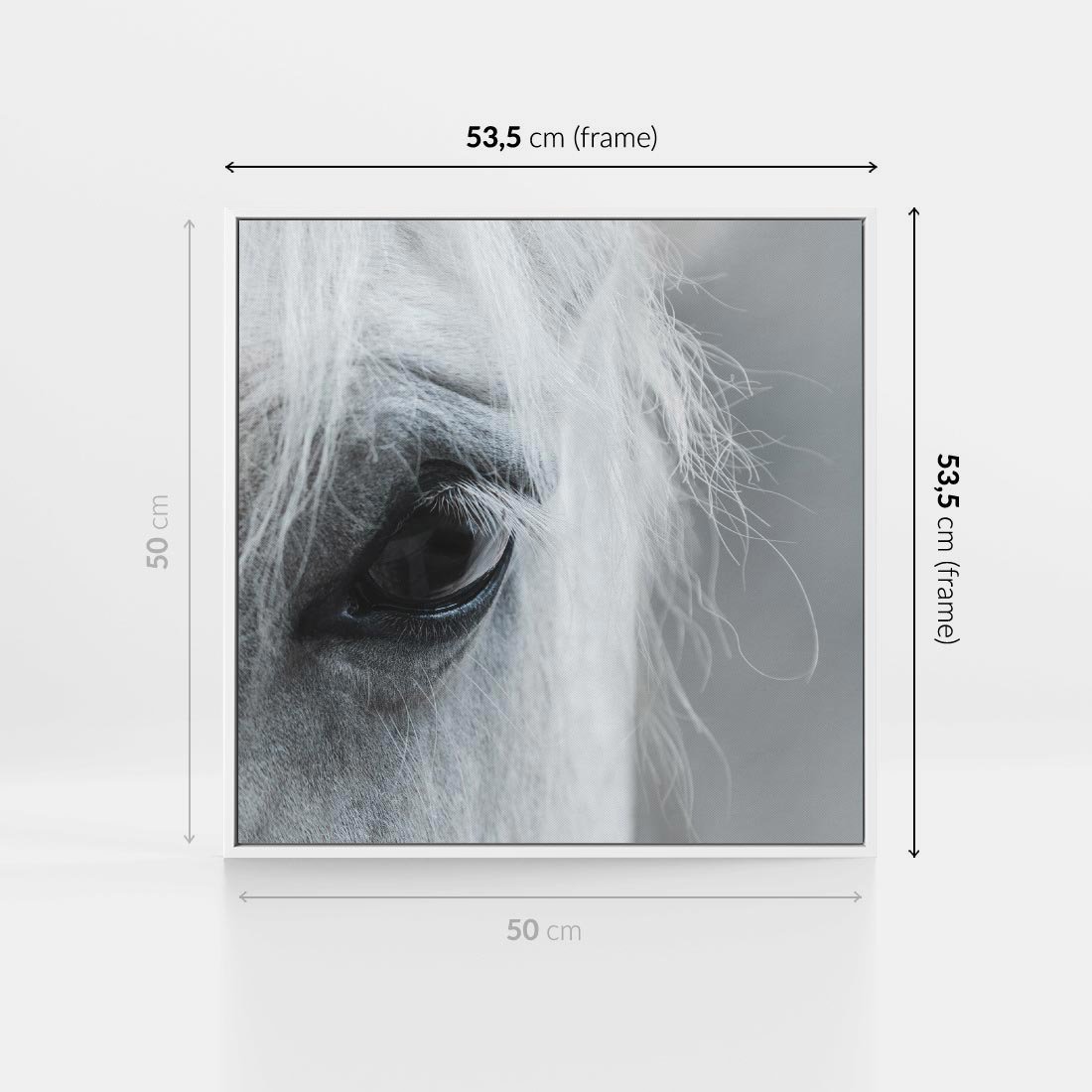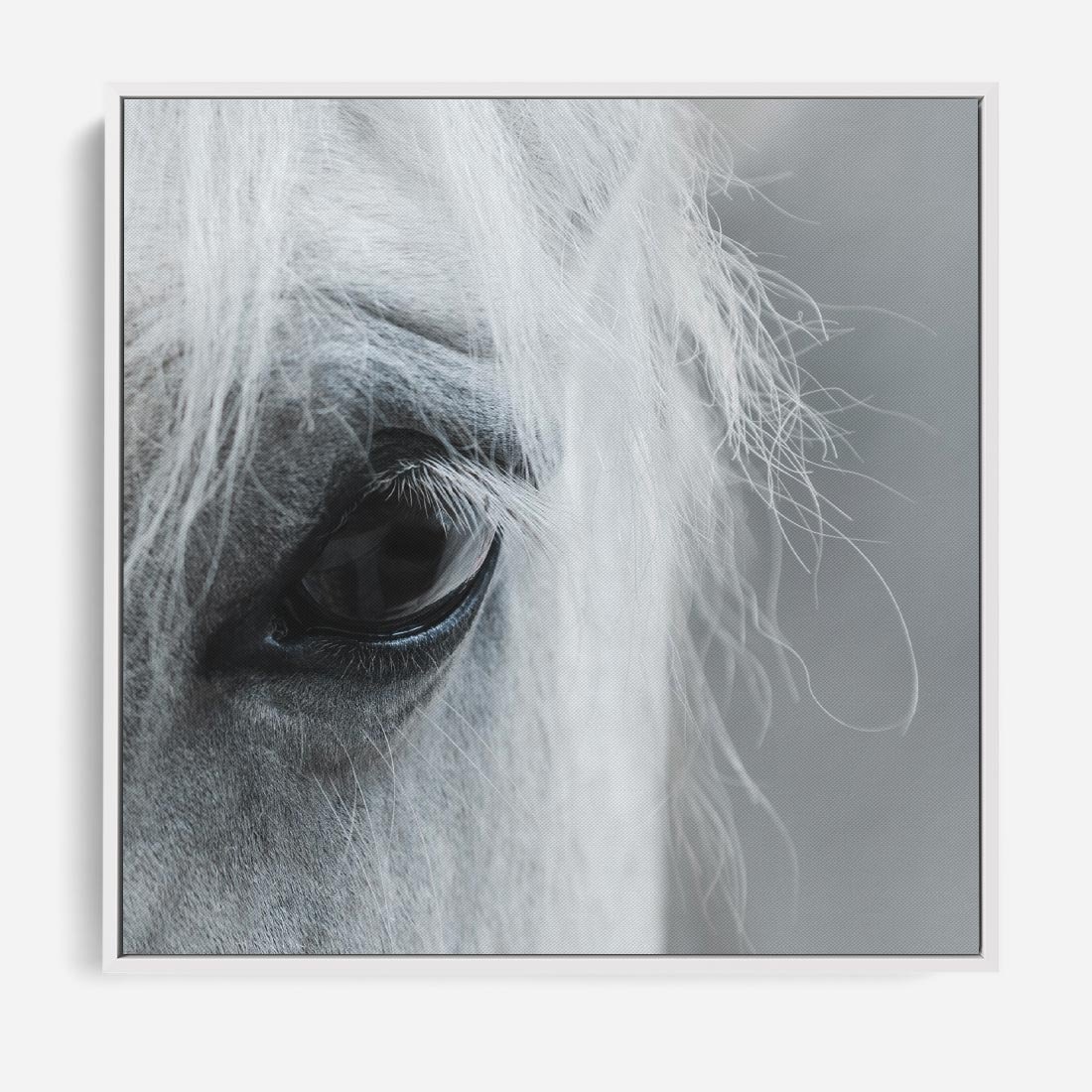 Obraz w ramie 50x50 - Oko Mocy - czarno białe zdjęcie, zbliżenie makro na oko konia - rama biała