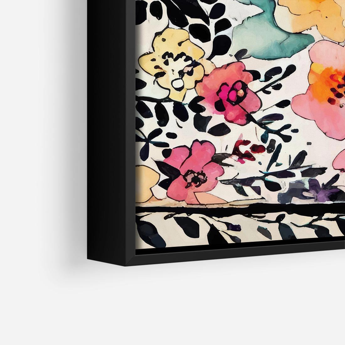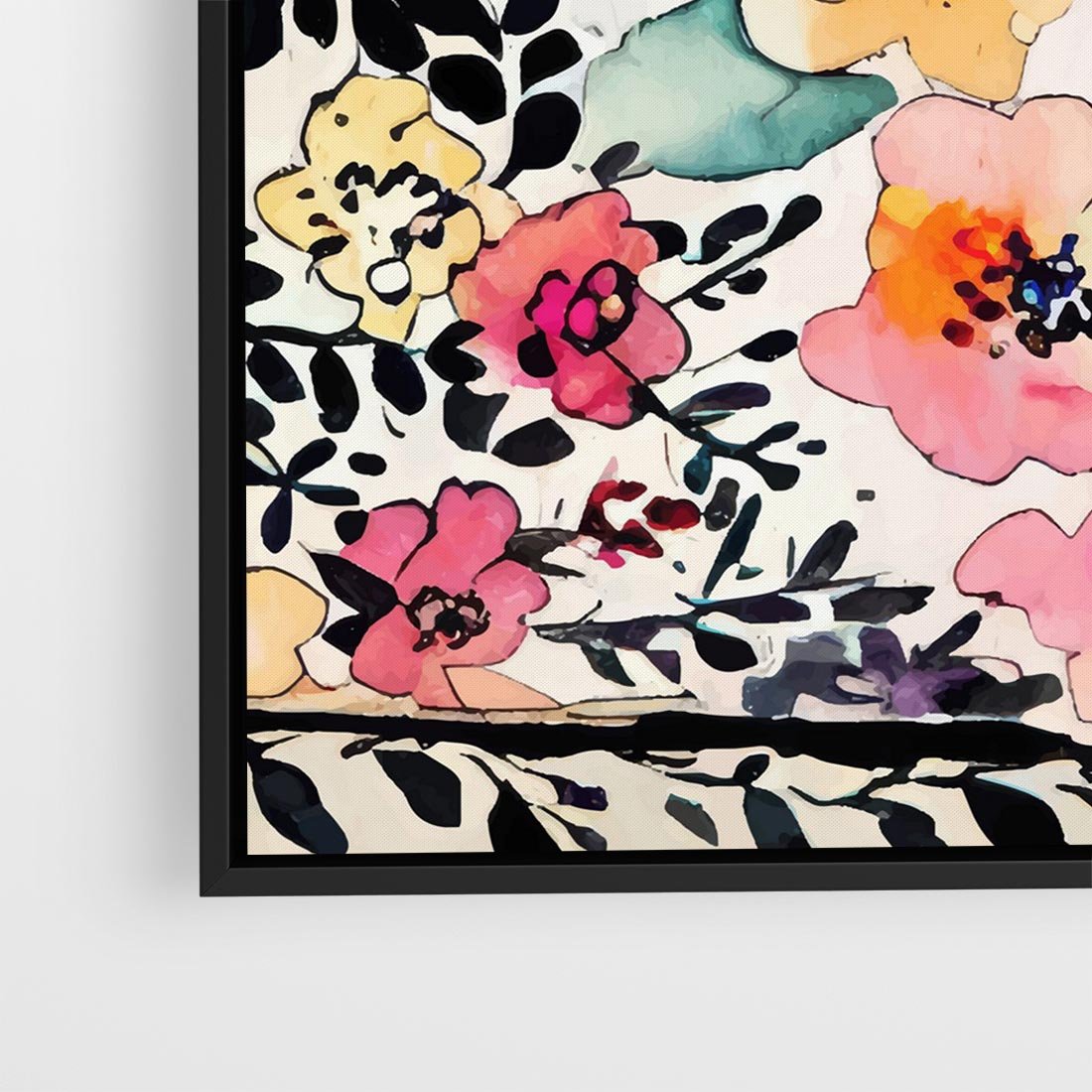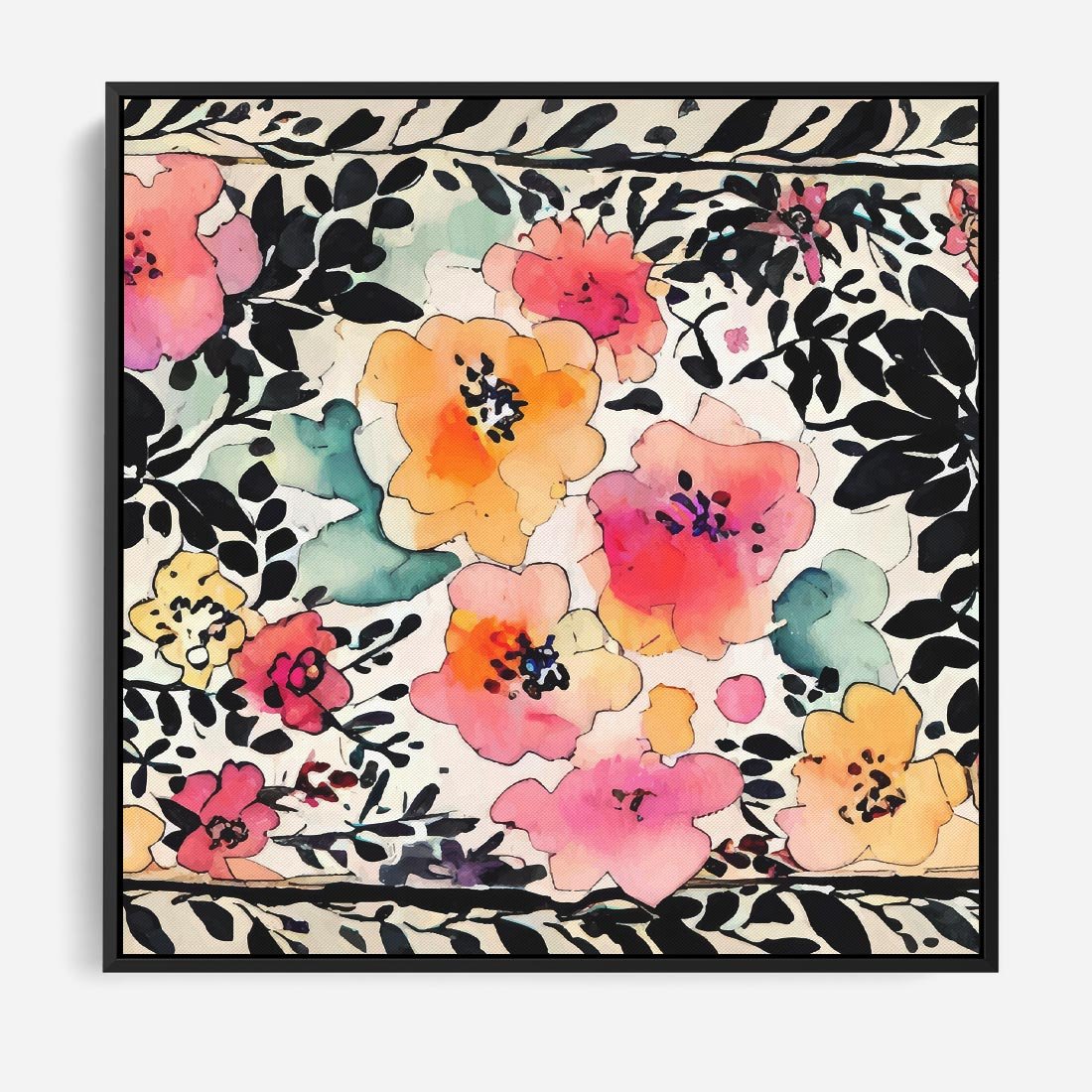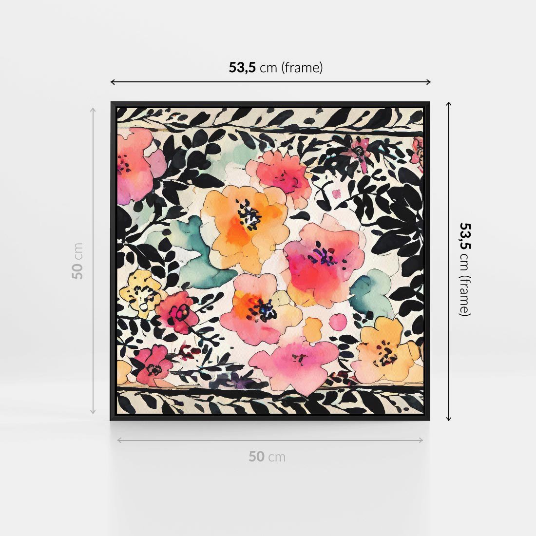 Obraz w ramie 50x50 - Opowieść w kroplach farb - akwarelowe kwiaty, mocna ornamentowa czarna ramka namalowana dookoła obrazu - rama czarna