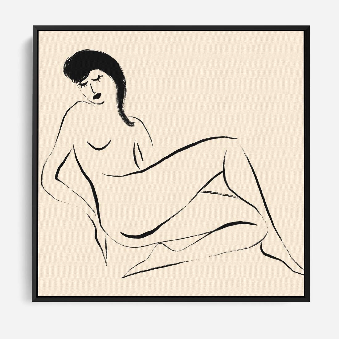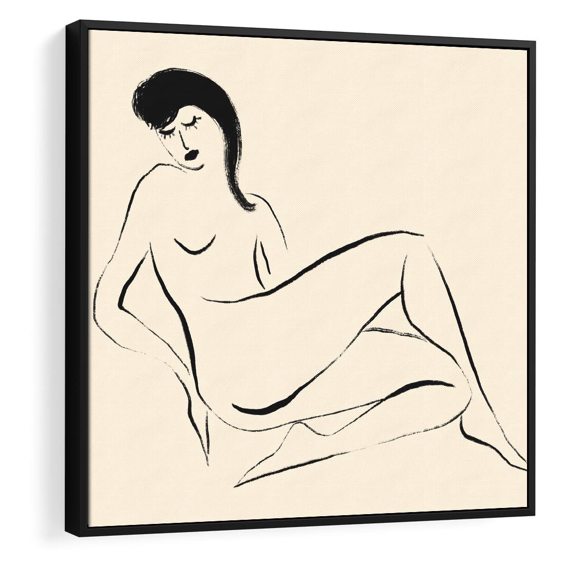 Ten abstrakcyjny rysunek w czarno-białym stylu namalowany minimalistyczną kreską przedstawia nagą kobietę. Delikatne linie podkreślają jej piękno i subtelność, jednocześnie pozostawiając miejsce na wyobraźnię i interpretację. To dzieło sztuki emanuje prostotą, jednocześnie ukazując głębię i wyrazistość ludzkiej formy.
