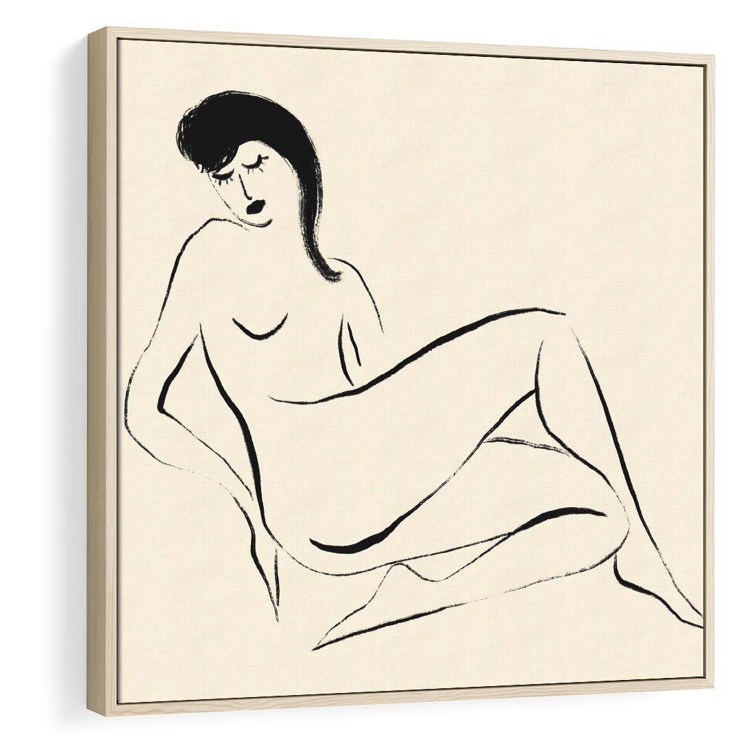 Ten abstrakcyjny rysunek w czarno-białym stylu namalowany minimalistyczną kreską przedstawia nagą kobietę. Delikatne linie podkreślają jej piękno i subtelność, jednocześnie pozostawiając miejsce na wyobraźnię i interpretację. To dzieło sztuki emanuje prostotą, jednocześnie ukazując głębię i wyrazistość ludzkiej formy.