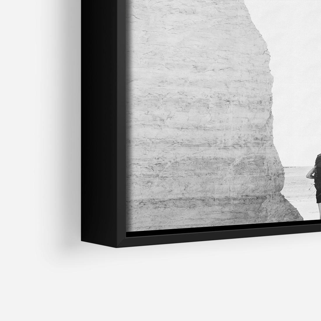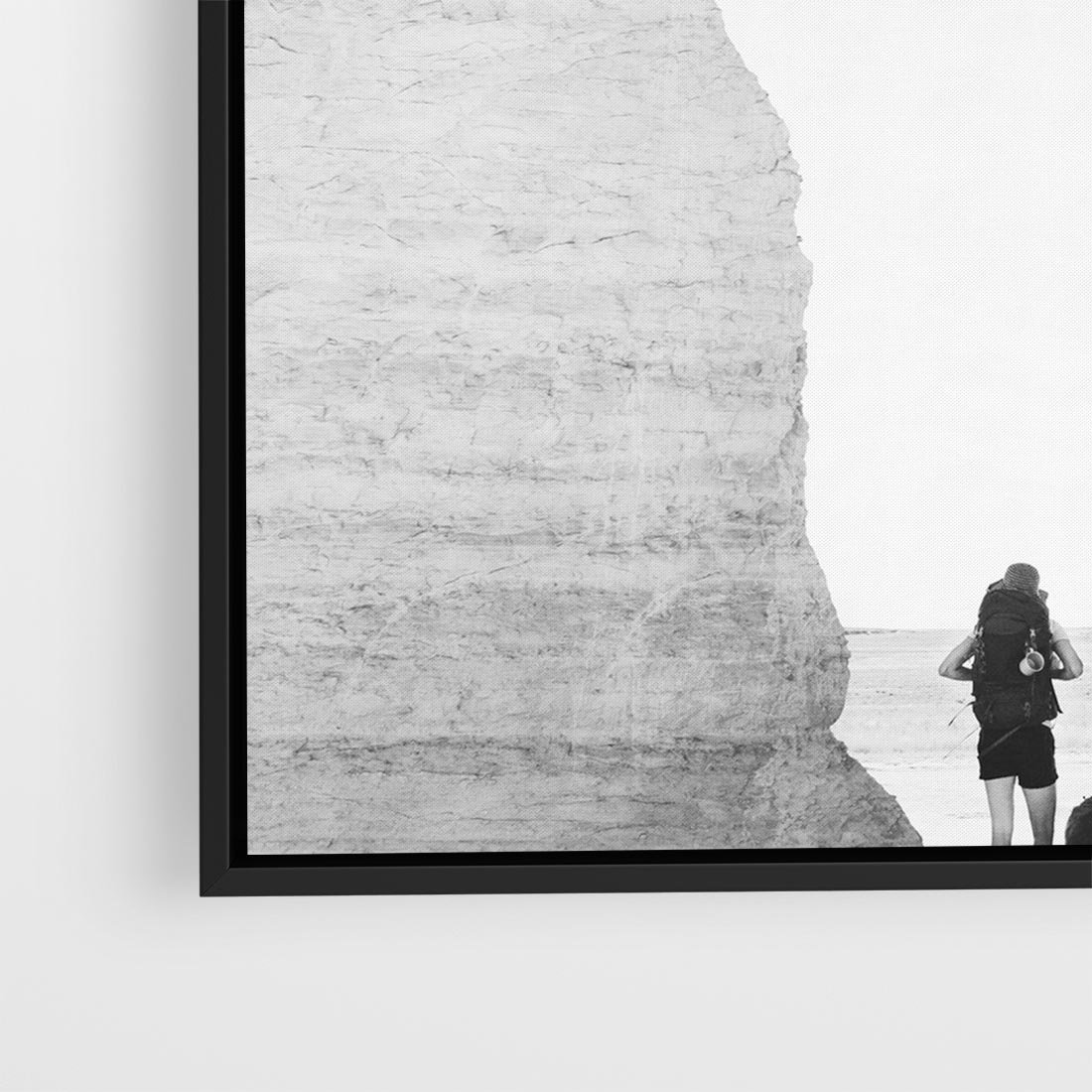 Ta czarno-biała fotografia przedstawia dwójkę podróżników, którzy eksplorują skaliste wybrzeże z psem na smyczy. W oddali rozciąga się widok na morze, tworząc malowniczą scenerię. Fotografia ta odzwierciedla ducha przygody i wspólnej podróży oraz piękno przyrody. Czarno-biała paleta kolorów nadaje zdjęciu klasyczny i nostalgiczny charakter, podkreślając jednocześnie atmosferę i emocje chwili. To doskonały element dekoracyjny do wnętrz, które cenią sobie podróżniczy duch i piękno przyrody.