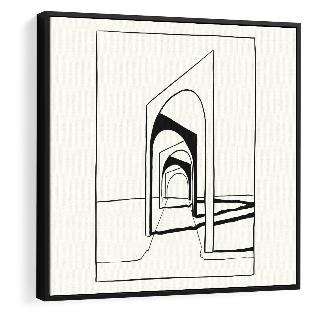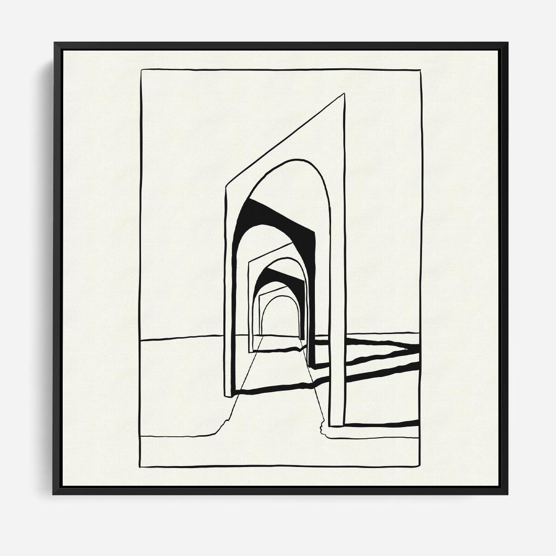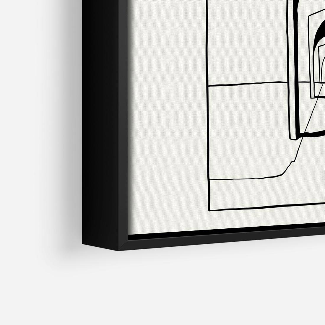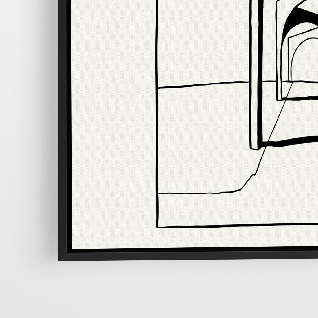 Ta nowoczesna sztuka kieruje uwagę na minimalistyczną piękno architektury, wykorzystując kontrastujące odcienie czerni i bieli. Geometryczne formy ożywają, tworząc kompozycję o wyraźnym i wyjątkowym charakterze.