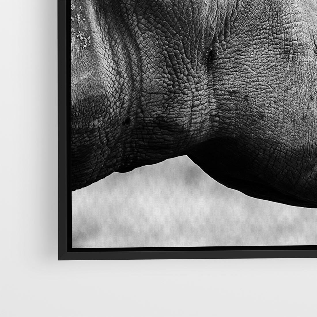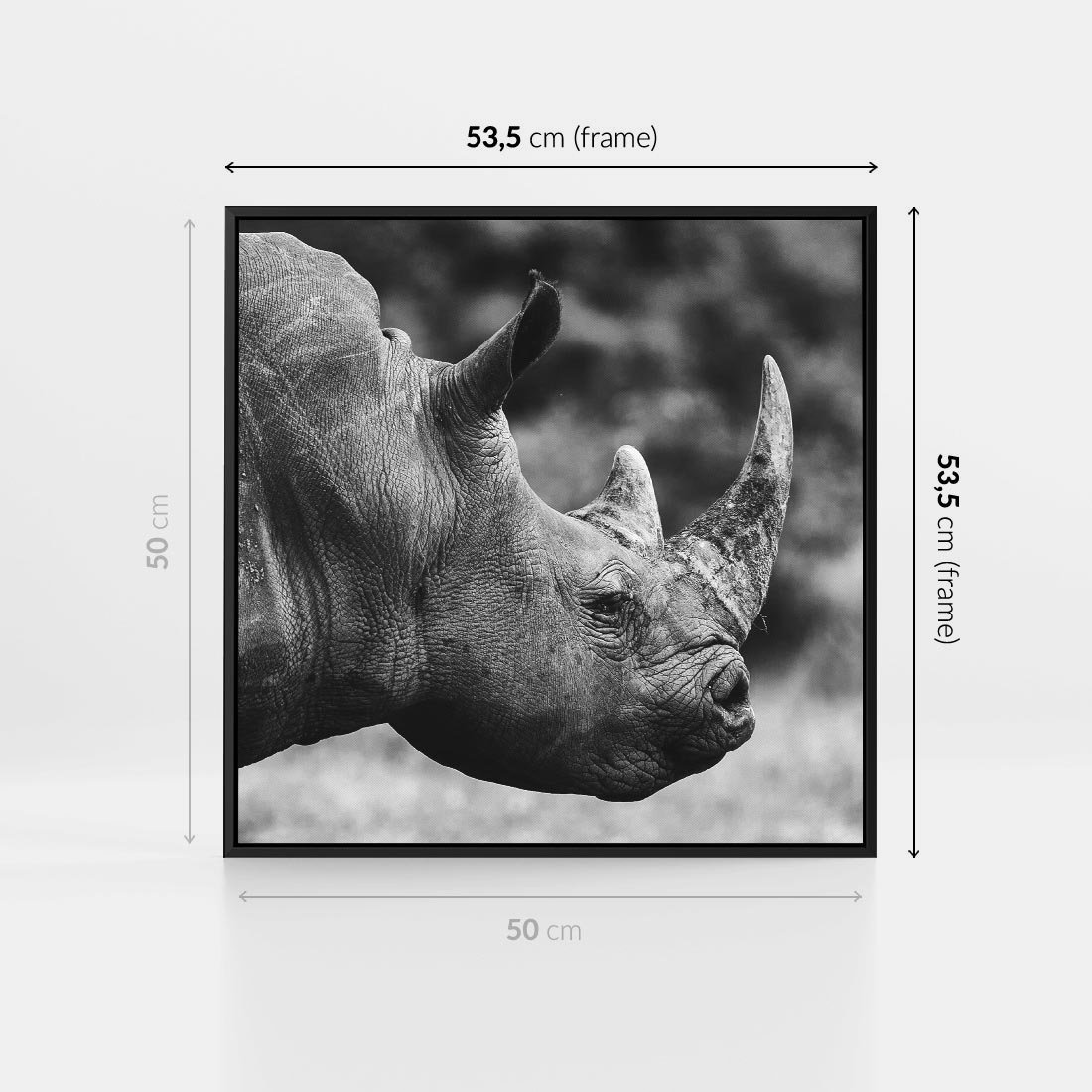Obraz w ramie 50x50 - Potęga Afryki - czarno biała fotografia, zbliżenie na postać nosorożca - rama czarna