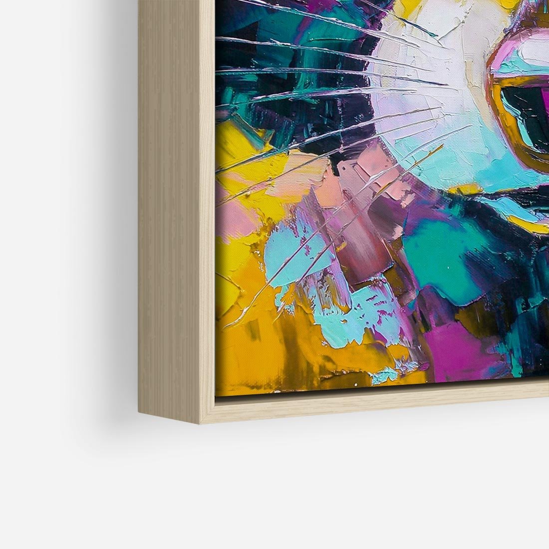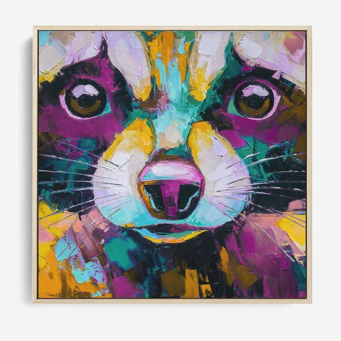 Abstrakcyjne zbliżenie na portret szopa pracza ukazuje zaskakującą paletę kolorów i ruchliwą abstrakcyjną kreskę. To wyjątkowe dzieło emanuje energią i żywiołowością, przyciągając spojrzenia i dodając wyjątkowego uroku każdemu wnętrzu. Odkryj nową perspektywę natury przez soczyste i dynamiczne barwy tego obrazu.