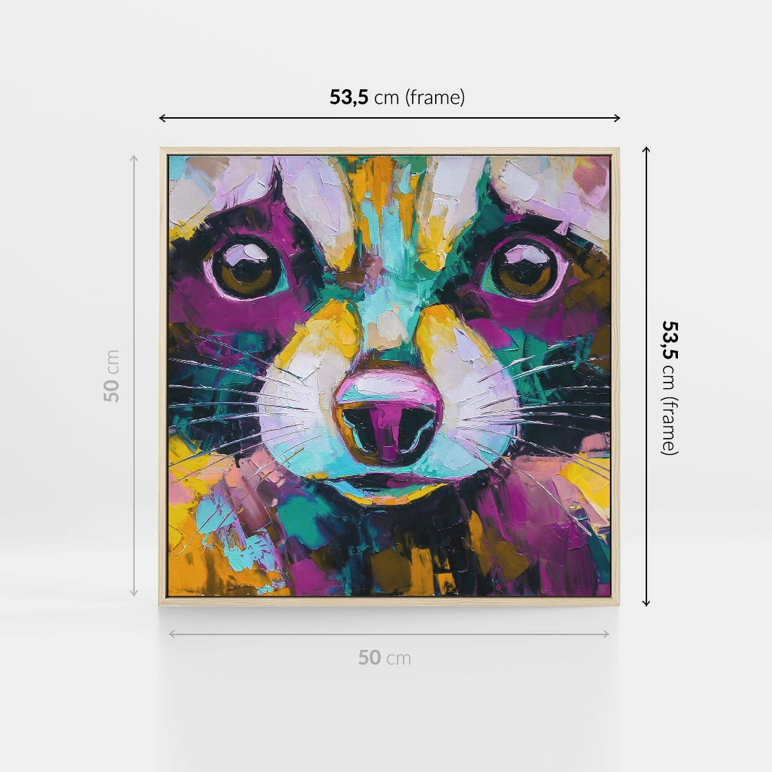 Obraz w ramie 50x50 - Przebudzenie snu artysty - zbliżenie, kolorowy portret szopa pracza - rama drewno