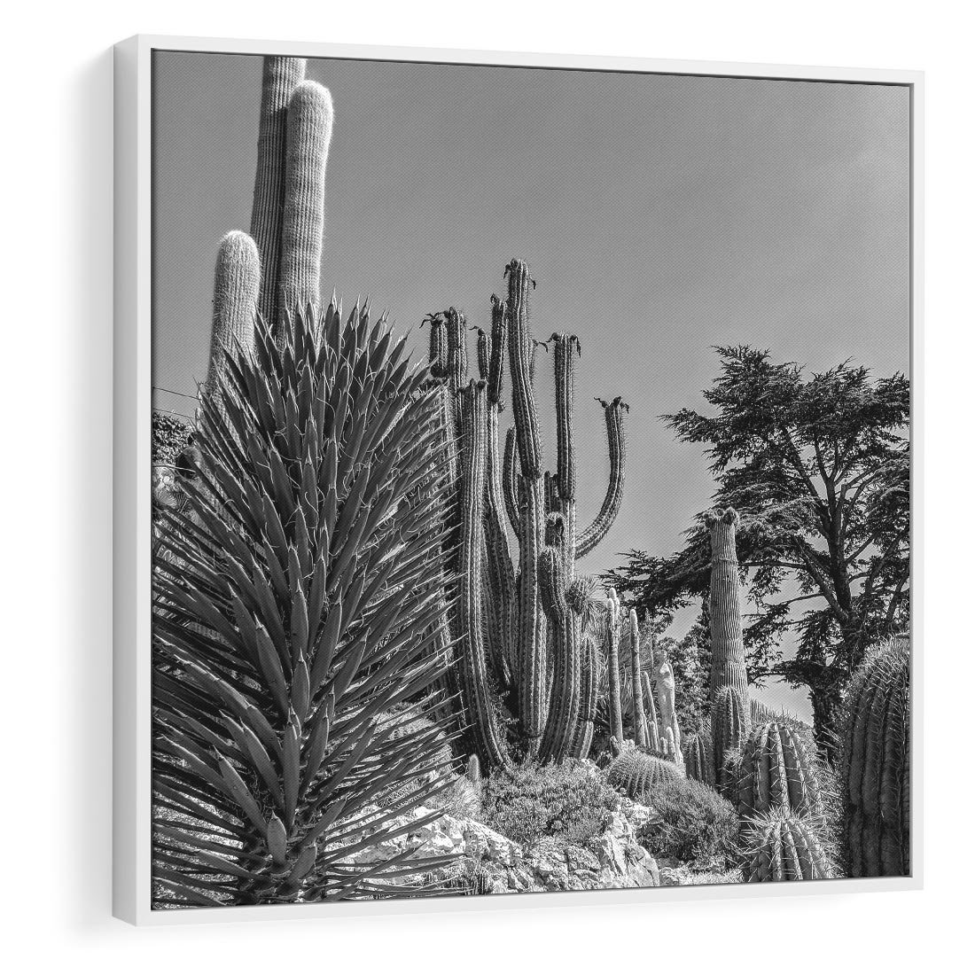 To czarno-białe zdjęcie ukazuje surową piękność pustyni, gdzie wydźwięk kontrastujących odcieni czerni i bieli podkreśla jej dzikość i spokój jednocześnie. Kaktusy, rosnące w tej niegościnnej przestrzeni, dodają kompozycji życia i symbolizują wytrwałość w trudnych warunkach. To zdjęcie emanuje spokojem i samotnością pustyni, co czyni je idealnym dodatkiem do minimalistycznych wnętrz, podkreślając urok prostoty i natury.