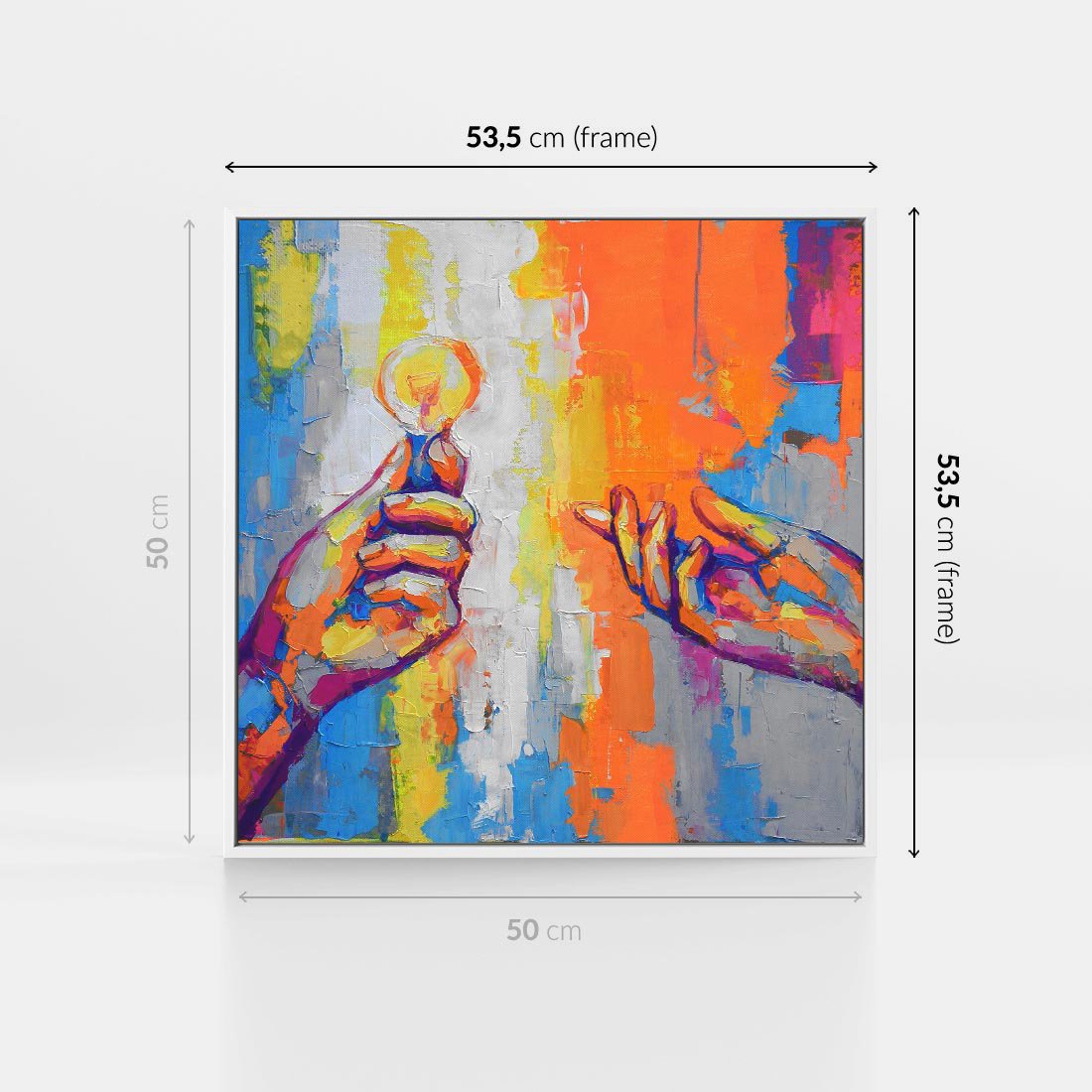 Obraz w ramie 50x50 - Refrakcje wewnętrznego światła - abstrakcyjne dzieło, dłoń trzyma żarówkę - rama biała