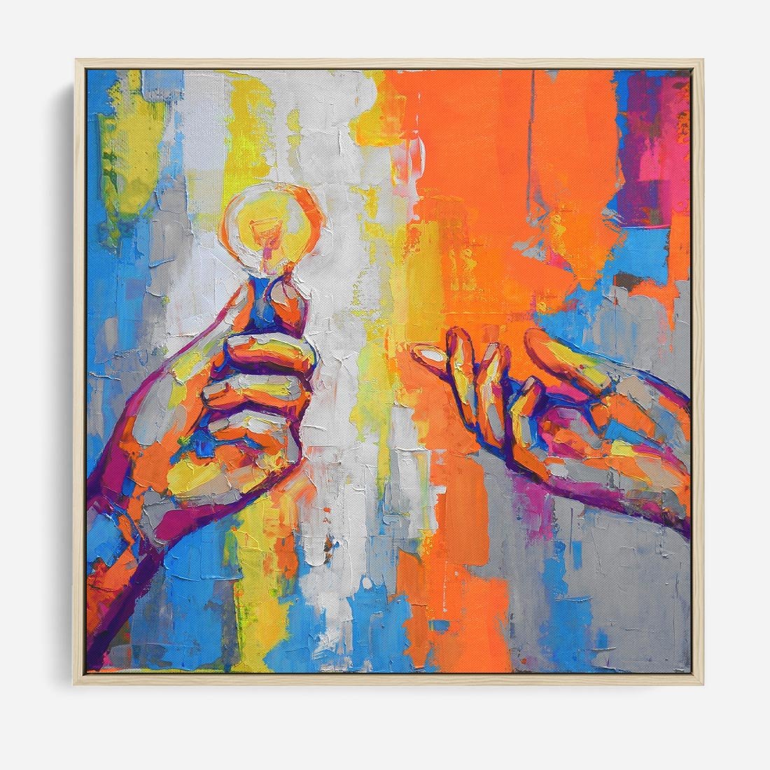 Obraz w ramie 50x50 - Refrakcje wewnętrznego światła - abstrakcyjne dzieło, dłoń trzyma żarówkę - rama drewno