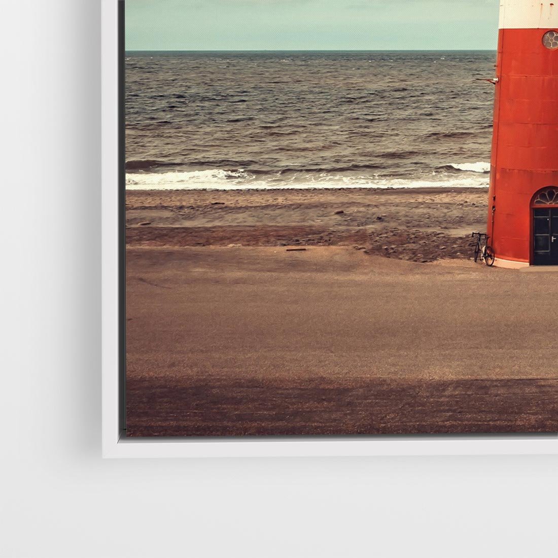Ta urokliwa fotografia utrzymana w stylu retro przedstawia malowniczą latarnię morską w czerwono-białe pasy. Jej wyrazisty design kontrastuje z zachmurzonym niebem i morzem w tle, nadając kompozycji niepowtarzalny charakter. To klasyczne piękno nadmorskiej scenerii, które przenosi nas w czasie i dodaje nostalgii do współczesności.
