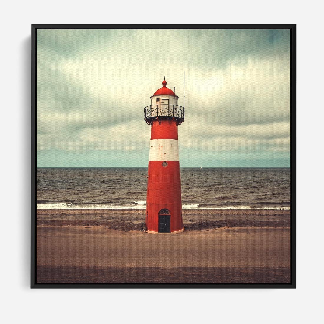 Ta urokliwa fotografia utrzymana w stylu retro przedstawia malowniczą latarnię morską w czerwono-białe pasy. Jej wyrazisty design kontrastuje z zachmurzonym niebem i morzem w tle, nadając kompozycji niepowtarzalny charakter. To klasyczne piękno nadmorskiej scenerii, które przenosi nas w czasie i dodaje nostalgii do współczesności.