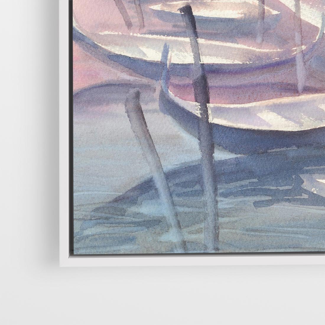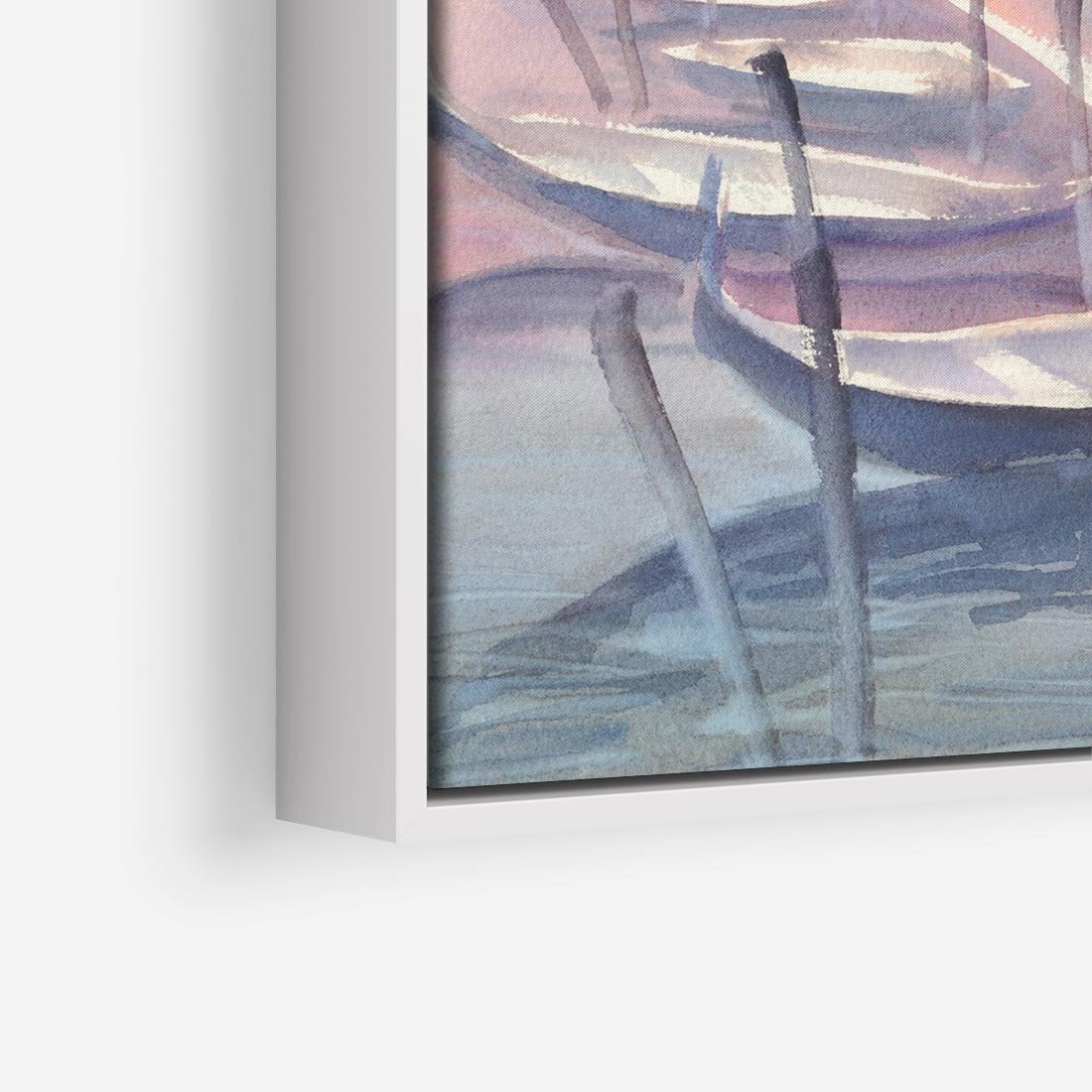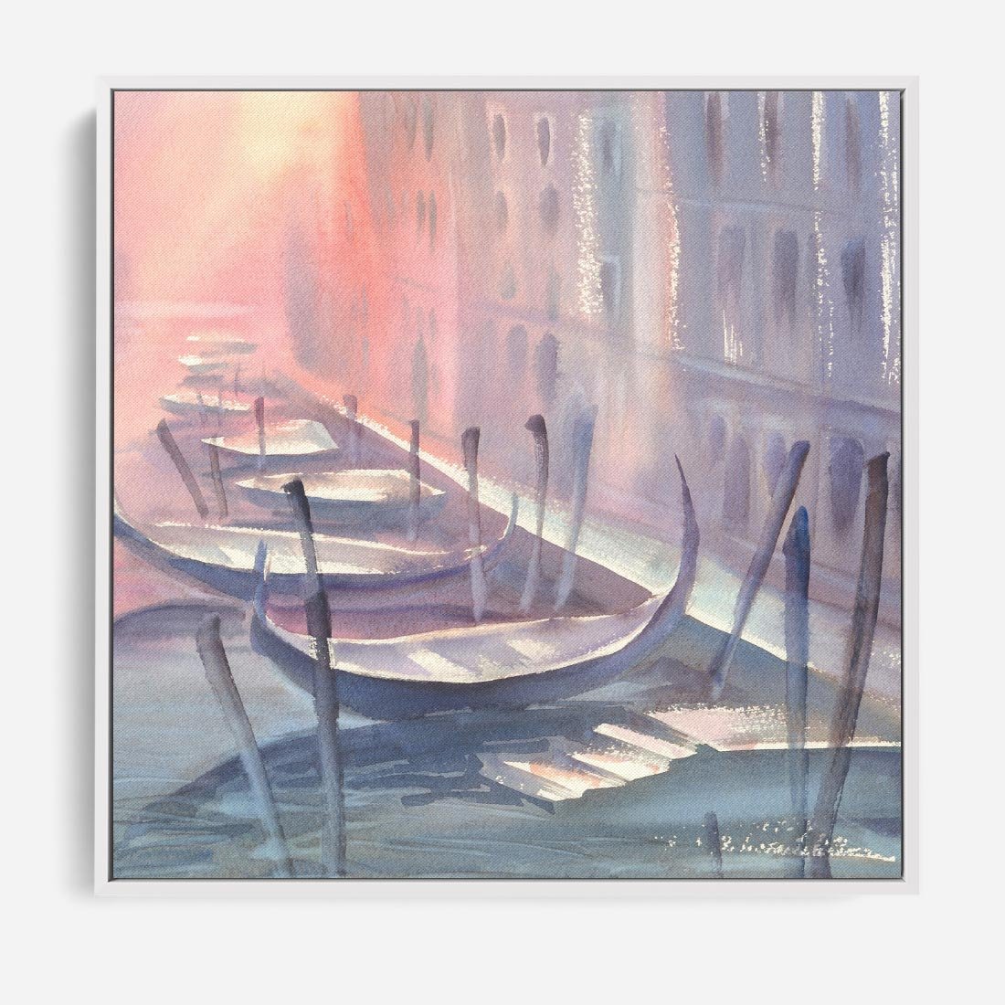 Ten akwarelowy rysunek przedstawia malownicze gondole na tle weneckiego kanału podczas zachodu słońca. Stonowane pastelowe kolory tworzą romantyczną aurę, podkreślając urok i magię Wenecji. To wizja spokoju i piękna, która przenosi nas w magiczny świat włoskiej laguny i zaprasza do kontemplacji nad pięknem przyrody i architektury.