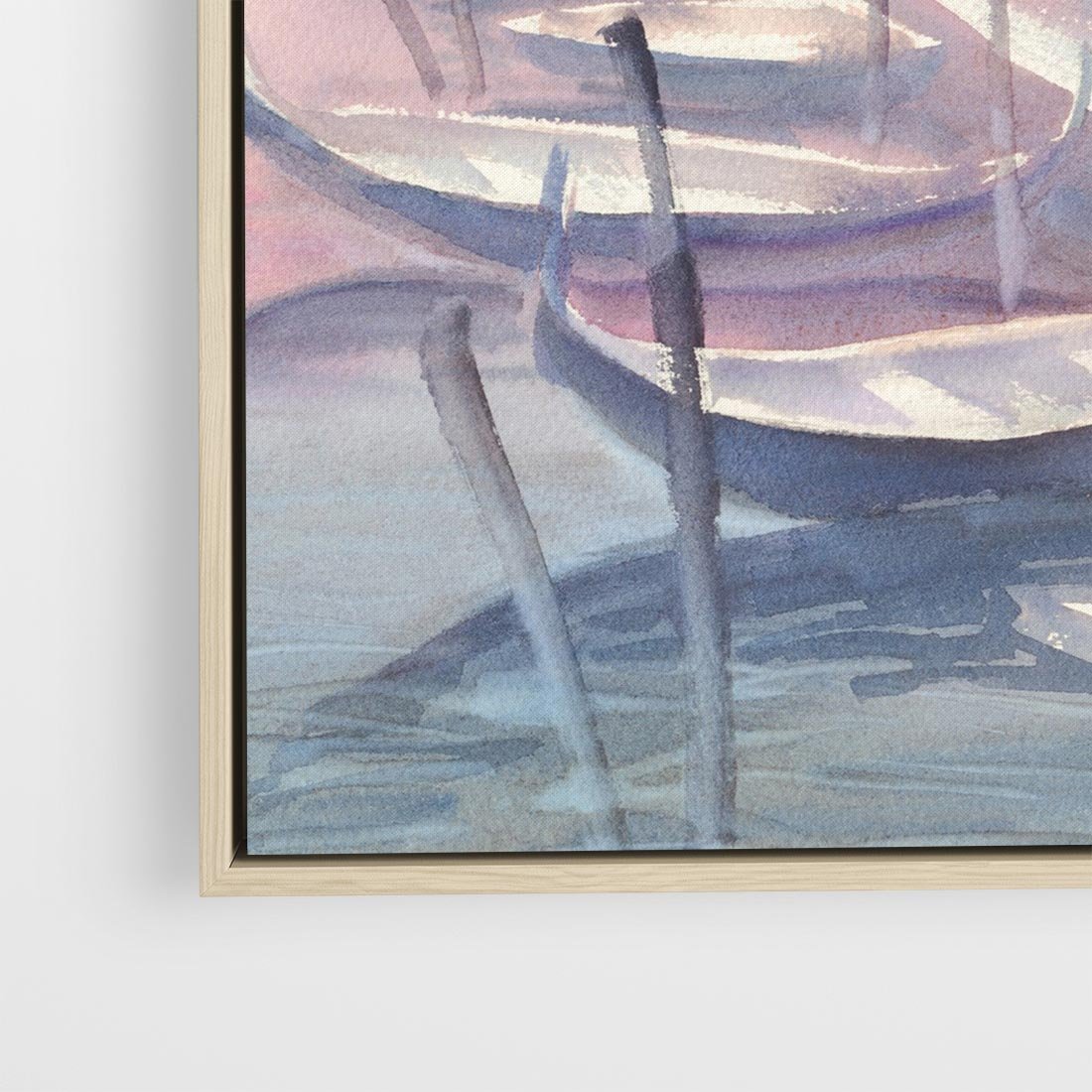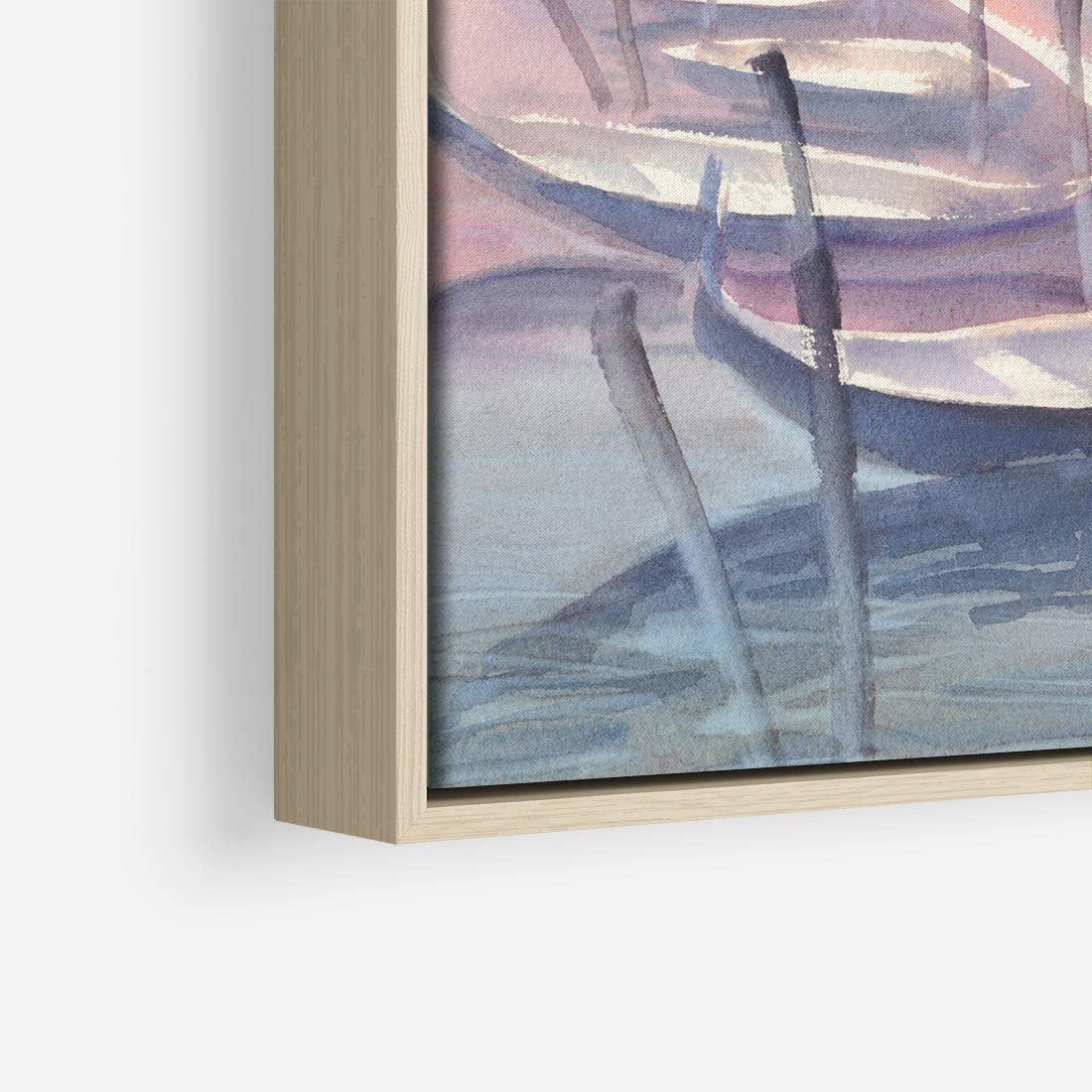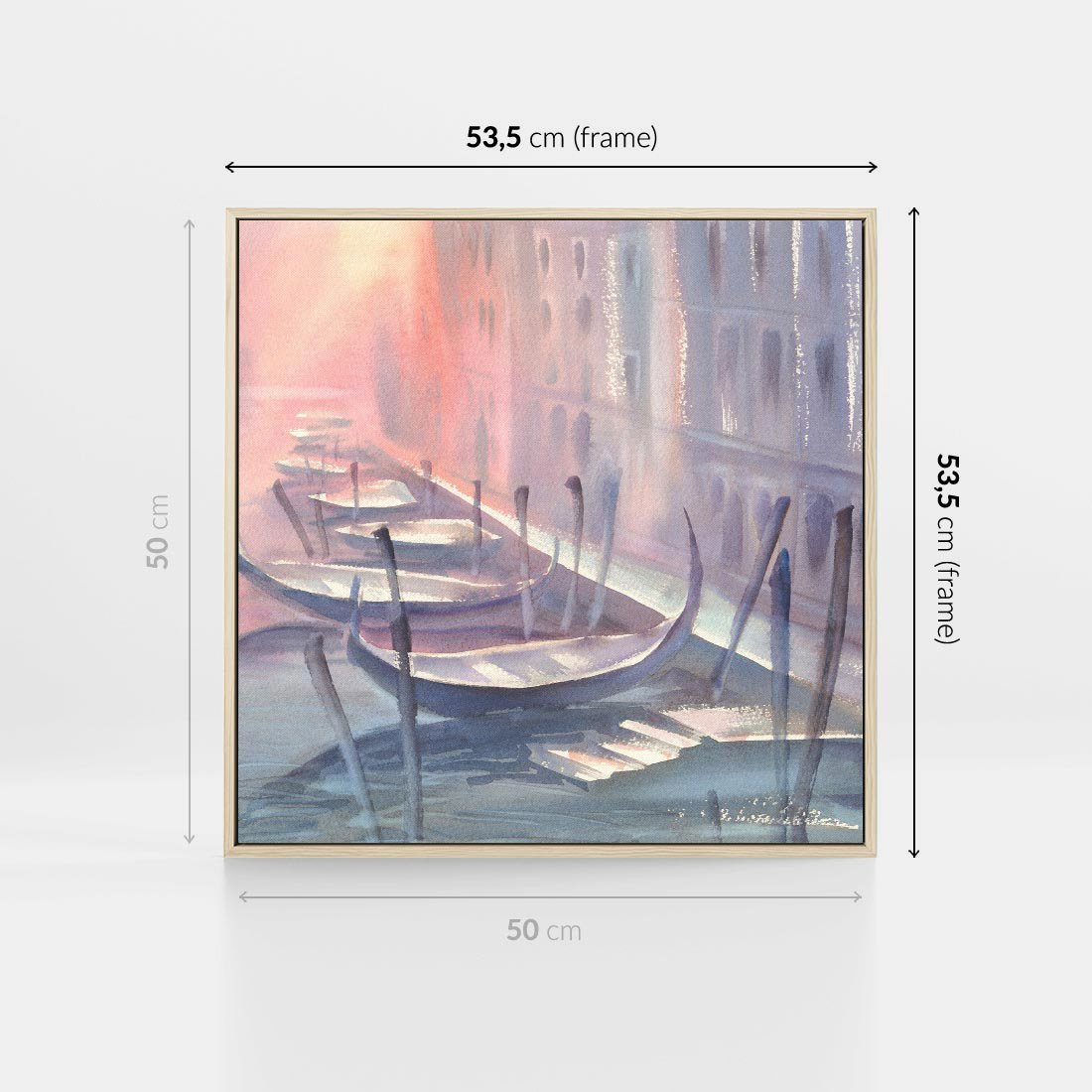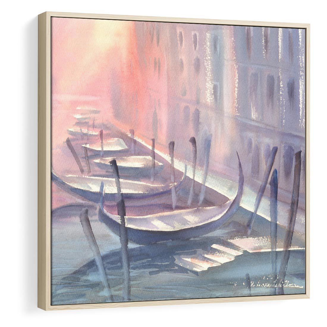 Ten akwarelowy rysunek przedstawia malownicze gondole na tle weneckiego kanału podczas zachodu słońca. Stonowane pastelowe kolory tworzą romantyczną aurę, podkreślając urok i magię Wenecji. To wizja spokoju i piękna, która przenosi nas w magiczny świat włoskiej laguny i zaprasza do kontemplacji nad pięknem przyrody i architektury.