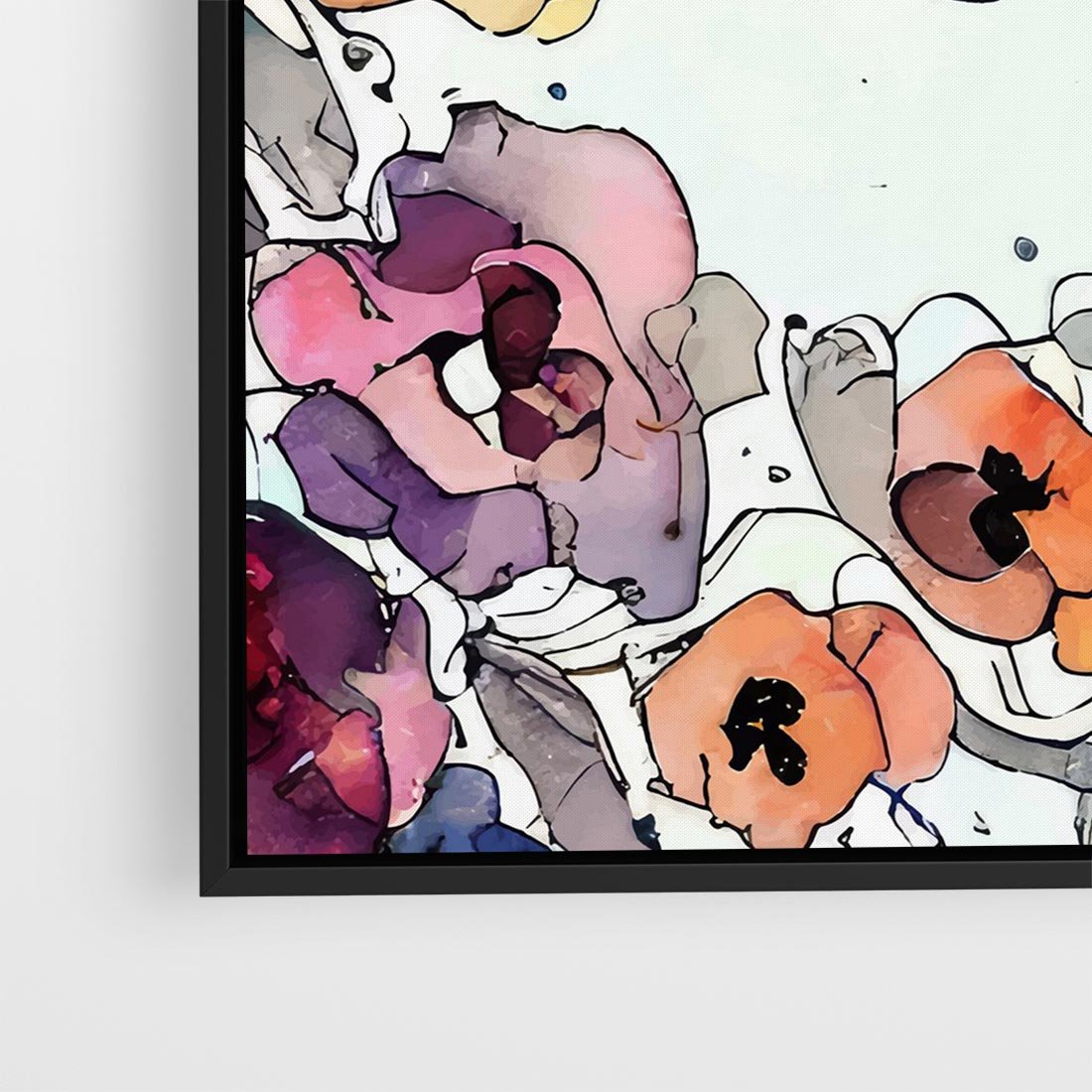 Ten obraz przypomina witrażowe kompozycje, gdzie akwarelowe kwiaty ożywają w intensywnych kolorach. Czarne kontury wydobywają ich piękno i nadają im wyrazistość. To połączenie kunsztu witrażowego z subtelnością kwiatowych motywów tworzy niepowtarzalną wizję natury.