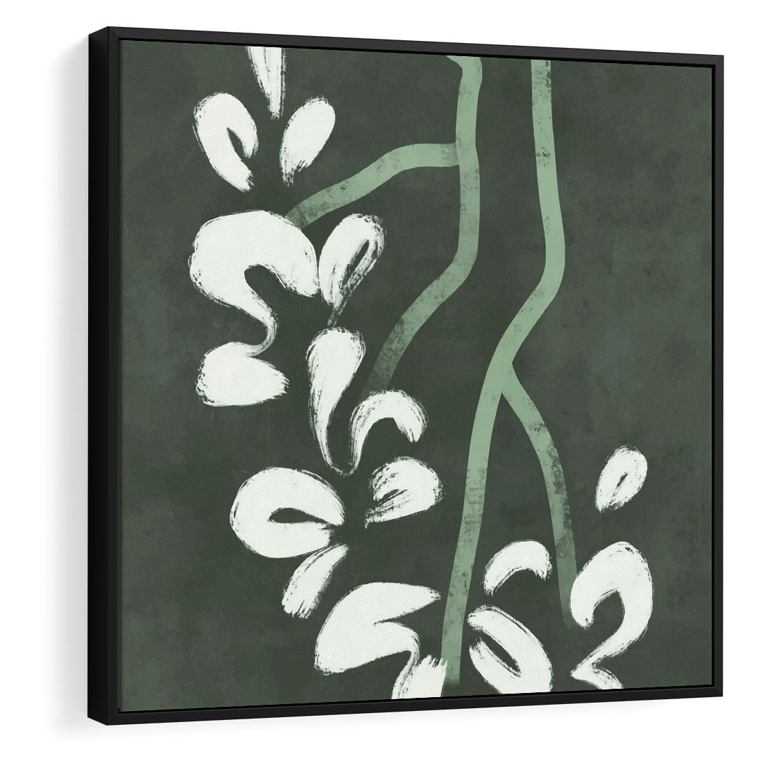 Obraz w ramie 50x50 - Rozkwitające Zielone Gałęzie - abstrakcyjne delikatne zielone linie, podobne do gałęzi kwiatów - rama czarna